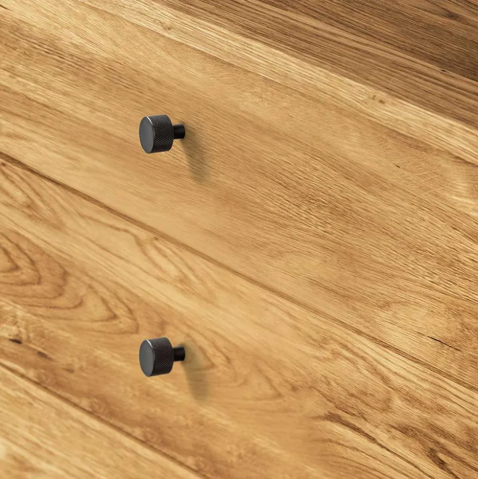 Die schwarzen, zylinderförmigen Metallgriffe mit eingraviertem Rautenmuster an den Schubladen und der Tür setzen stilvolle Akzente und unterstreichen das edle Design der Kommode „Hardus“. Diese Griffe sind nicht nur optisch ansprechend, sondern auch sehr ergonomisch, was die Handhabung der Schubladen und der Tür besonders angenehm macht.