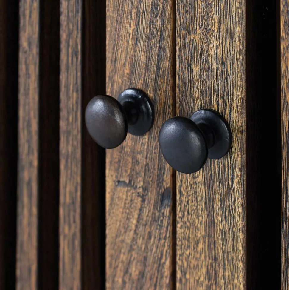 Der Schrank „Charin“ besticht nicht nur durch sein Design, sondern auch durch seine hochwertigen Materialien. Die massiven Akazienholzflächen bieten eine solide Basis und versprechen eine lange Lebensdauer. Akazienholz ist besonders widerstandsfähig und zeichnet sich durch eine wunderschöne, einzigartige Maserung aus, die jedem Möbelstück einen individuellen Charme verleiht. Das Metallgestell in Schwarz sorgt für zusätzliche Stabilität und setzt einen modernen Kontrast zu den warmen Holzflächen. Die runden Knopfgriffe aus schwarzem Metall unterstreichen das durchdachte Design und bieten eine komfortable Handhabung.