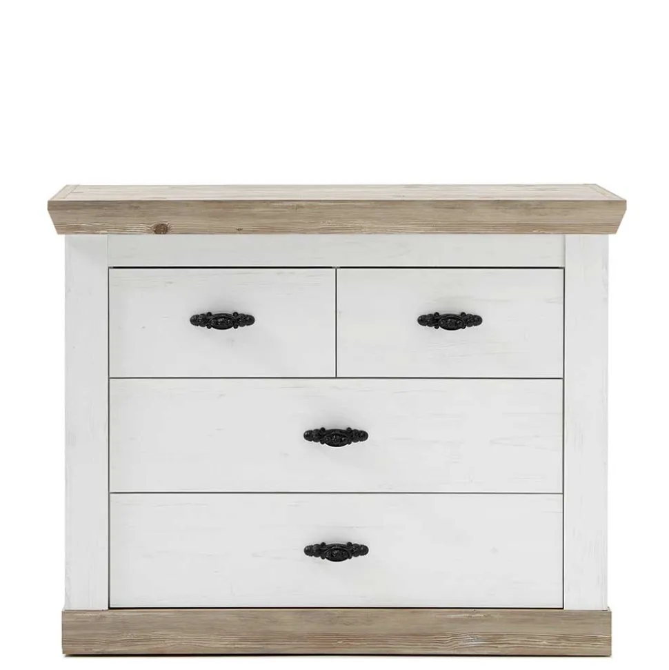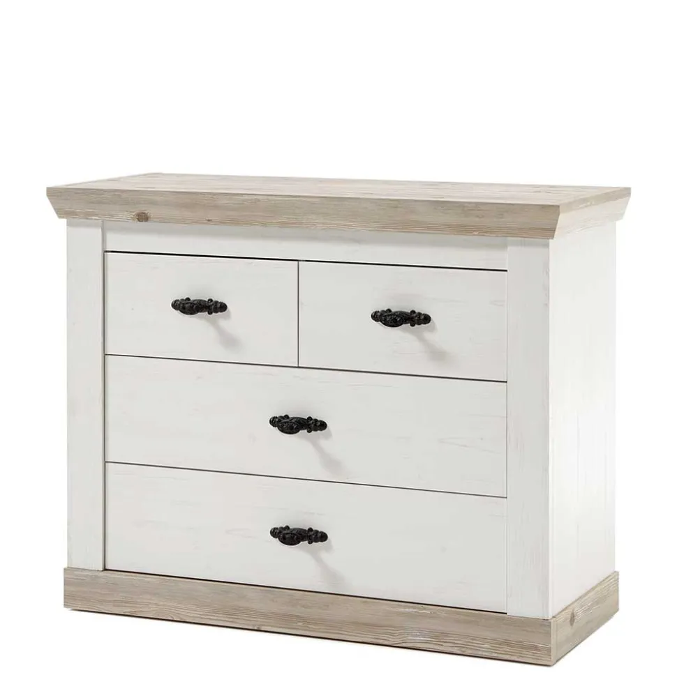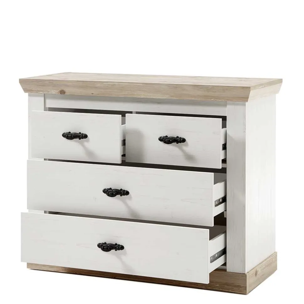 Die zweifarbige Optik der Kommode „Nedita“ verleiht ihr eine besondere Ausdruckskraft. Das harmonische Zusammenspiel von Weiß und Pinie verwittert verleiht Ihrem Wohnraum eine warme und gemütliche Atmosphäre. Die sorgfältig ausgewählten Farben und die hochwertige Folierung sorgen für eine edle Anmutung, die sich nahtlos in verschiedenste Einrichtungsstile integrieren lässt.