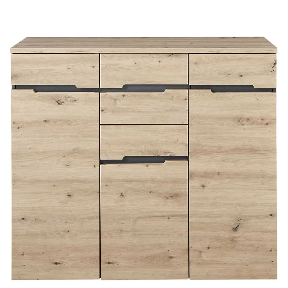 Ausgefräste Griffmulden erleichtern das Öffnen der Türen und Schubladen und verleihen der Kommode einen modernen Touch. Sie steht stabil auf flachen Kunststoffgleitern in Schwarz, die den Boden schonen und gleichzeitig für sicheren Stand sorgen. Für zusätzliche Sicherheit empfehlen wir eine Kippsicherung an der Wand, die besonders in Haushalten mit Kindern von Vorteil ist.