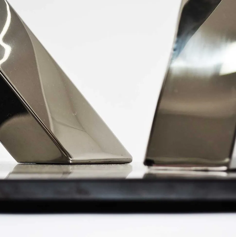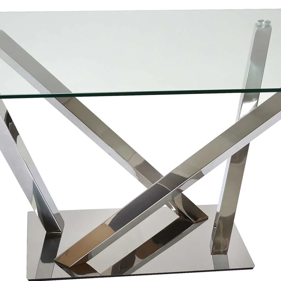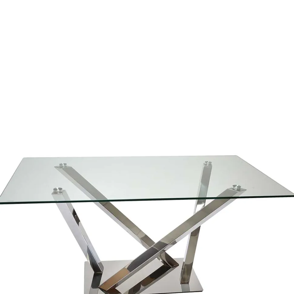 Der Esszimmer Glastisch Tyres ist ein gestalterisches Meisterwerk aus Edelstahl und Sicherheitsglas. Die rechteckige Formgebung der 15 mm starken Platte aus Sicherheitsglasplatte und die glänzend polierte Metall-Oberflächen des extravaganten Mikado-Gestells mit Bodenplatte aus Edelstahl machen den Tisch zu einem bemerkenswerten Eyecatcher.