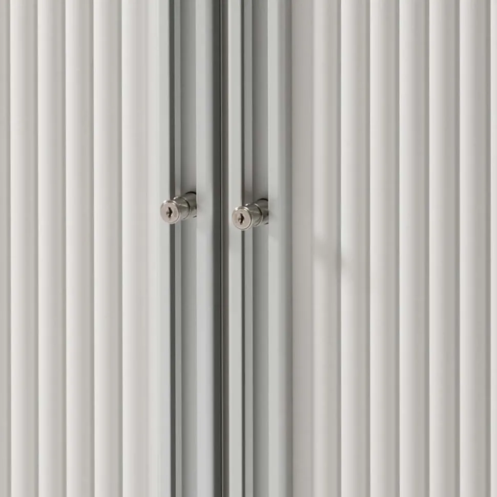 Mit Maßen von 196 cm Breite, 82 cm Höhe und 45 cm Tiefe und der Möglichkeit, die zwei Universalschränke individuell zu platzieren, passt „Bassy“ sich perfekt an Ihre Bedürfnisse an. Ob stehend oder liegend – Sie entscheiden. Die abschließbaren Rolläden und der verstellbare Fachboden bieten optimalen Stauraum für all Ihre Schätze. Die Griffleiste aus Aluminium setzt dabei einen stilvollen Akzent.