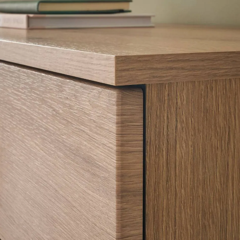 Lange Griffleisten aus schwarzem Kunststoff setzen einen markanten Kontrast zur warmen Eichenoptik und greifen das moderne Gesamtkonzept des Möbels elegant auf. Die flachen, schwarzen Kunststoff-Füße sorgen für einen stabilen Stand und unterstreichen den zeitgemäßen Look. Für zusätzliche Sicherheit im Alltag ist eine Kippsicherung zur Wandmontage vorgesehen – besonders wichtig in Haushalten mit Kindern oder auf unebenem Boden.