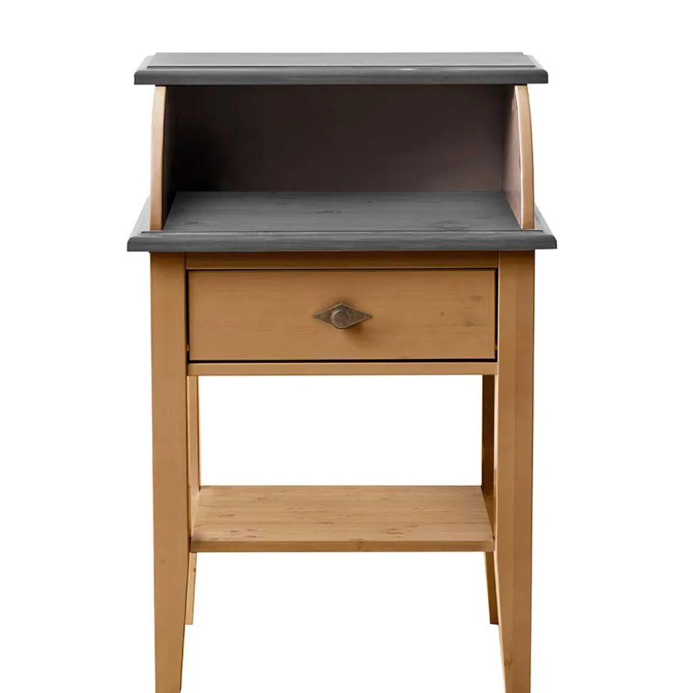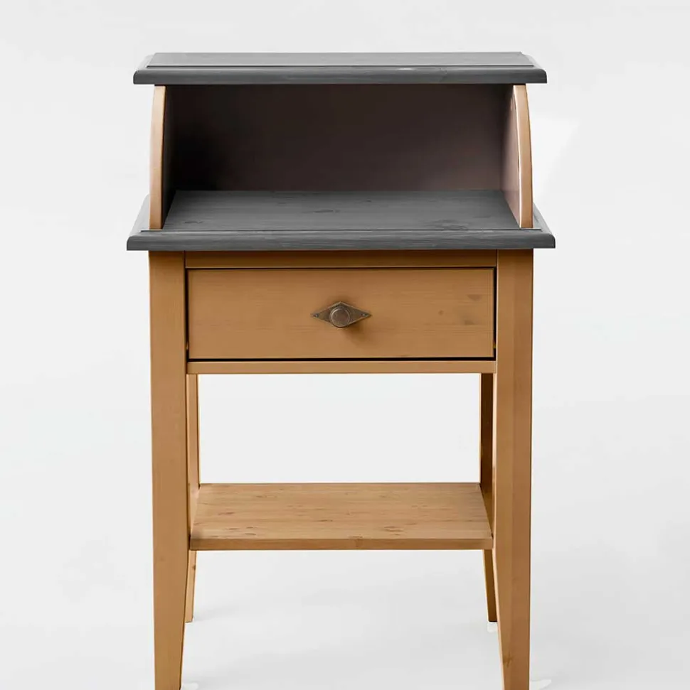 Die Oberfläche des Telefontisches ist in Laugenfarben gebeizt und geölt, was dem Holz einen warmen und einladenden Charakter verleiht. Die Tisch- und Oberplatte in Grau lackiert, hebt die natürliche Holzmaserung hervor und bietet zusätzlichen Schutz. Dieser zweifarbige Look verleiht dem Möbelstück eine moderne und doch zeitlose Eleganz.