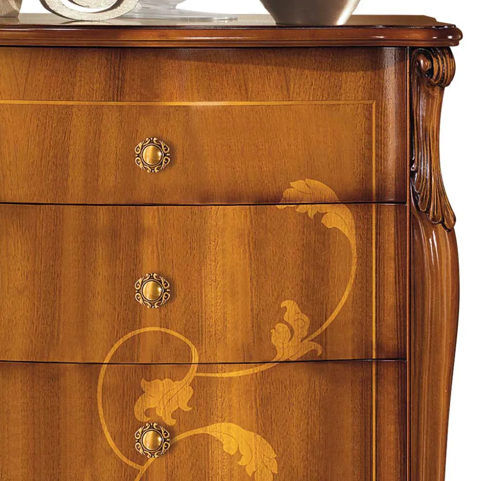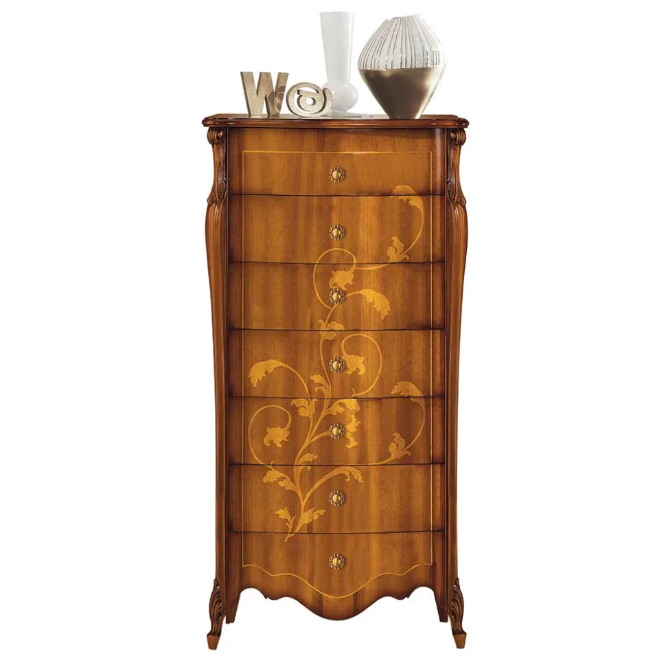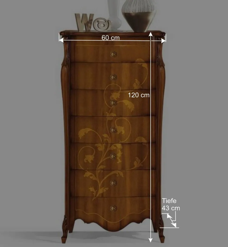 Für die Hochkommode Carlenna werden Massivhölzer (Tulpenbaum, Pappel) und Holzwerkstoffe (MDF, Schichtholz Tanne) verwendet und mit einem Furnier aus echtem Nussbaumholz belegt und lackiert. Die Schubladenfronten erhalten zudem eine romantisch-attraktive Note durch florale Einlegearbeiten (handgefertigte Intarsien) aus Pappel. Markante Acanthus-Schnitzereien an den Seitenelementen sowie im Bereich der Holzbeine aus Tulpenbaum verfeinern das elegante Erscheinungsbild der Hochkommode weiter. Die kleinen Metall-Griffknöpfe an den Schubladen sind überaus filigran gearbeitet und passen perfekt zum stilvollen Look des Möbelstücks.