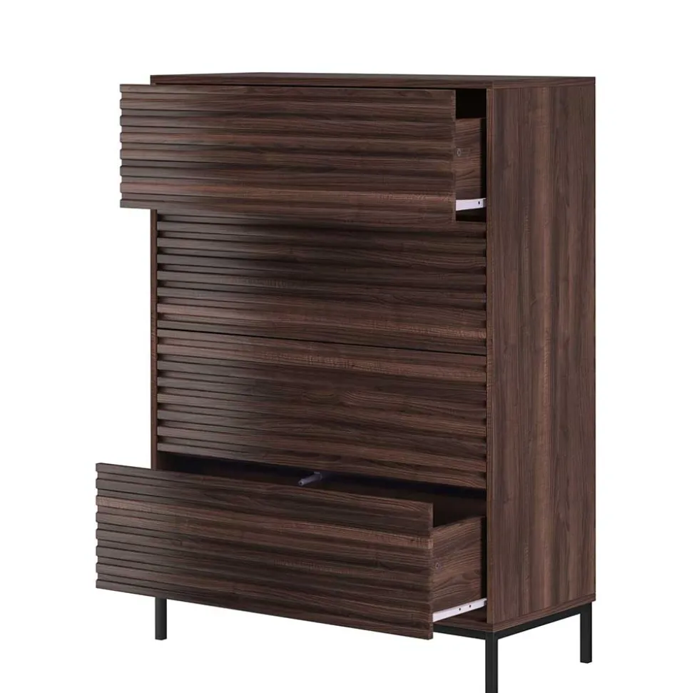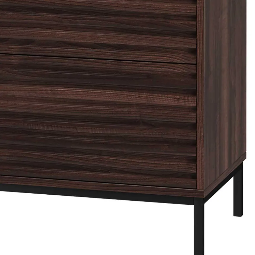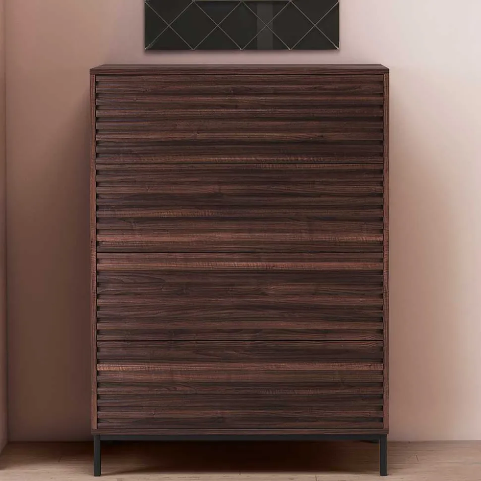 Gefertigt aus einer robusten Mischung aus MDF und Spanplatte, bietet diese Kommode eine stabile Konstruktion mit pflegeleichten, folierten Oberflächen. Die Schubladenfronten in Walnuss-Optik sind mit dezenten horizontalen Rillen versehen, die das Design auflockern und zusätzliche Eleganz verleihen. Das filigrane Vierfußgestell aus schwarzem Metall sorgt für einen modernen, luftigen Look und gewährleistet gleichzeitig einen sicheren Stand.