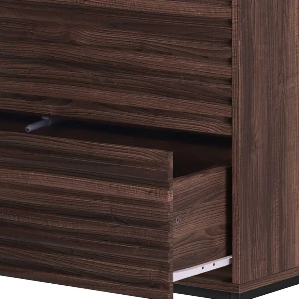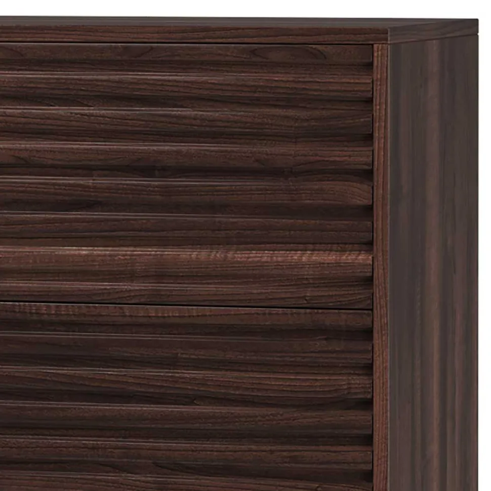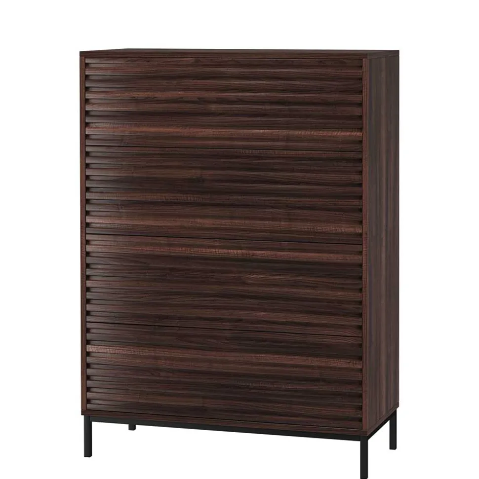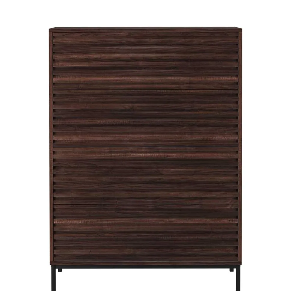 Gefertigt aus einer robusten Mischung aus MDF und Spanplatte, bietet diese Kommode eine stabile Konstruktion mit pflegeleichten, folierten Oberflächen. Die Schubladenfronten in Walnuss-Optik sind mit dezenten horizontalen Rillen versehen, die das Design auflockern und zusätzliche Eleganz verleihen. Das filigrane Vierfußgestell aus schwarzem Metall sorgt für einen modernen, luftigen Look und gewährleistet gleichzeitig einen sicheren Stand.