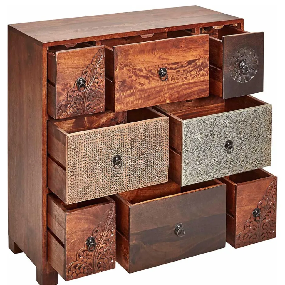 Mit insgesamt acht Schubladen bietet Ihnen die „Welina“ ausreichend Stauraum für all Ihre persönlichen Gegenstände. Die unterschiedlichen Größen der Schubladen ermöglichen eine vielseitige Nutzung, während die rustikalen Metall-Ringgriffe in Silberfarben einen charmanten Kontrast zum Holz bieten.