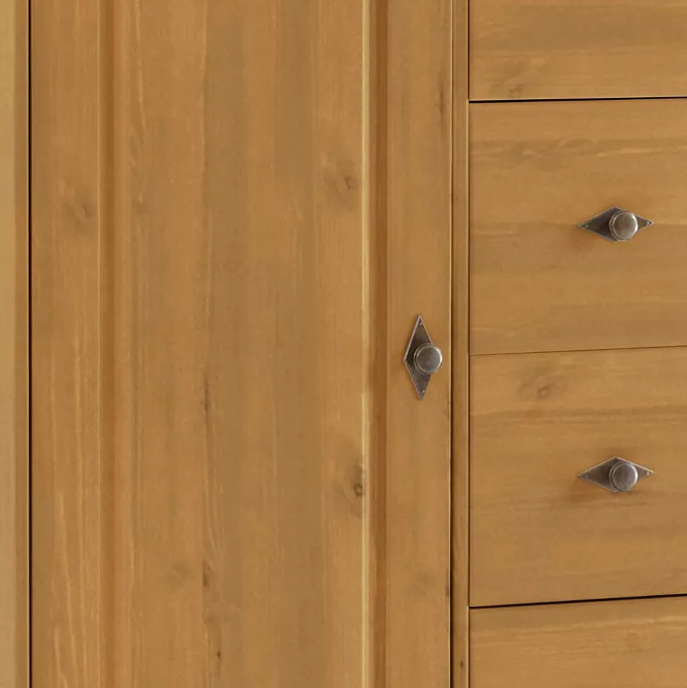 Die Kombikommode ist aus einem robusten Mix aus Sperrholz für Schubkastenrahmen, -böden und Rückwand sowie massiver nordischer Kiefer gefertigt. Kiefernholz ist bekannt für seine Stärke und Haltbarkeit und bringt zudem eine warme, natürliche Note in Ihr Zuhause. Die Oberfläche, in Laugenfarben gebeizt und geölt, zeigt die attraktive Holzmaserung und ist mit grauen Absetzungen lackiert – ein wahrer Blickfang!