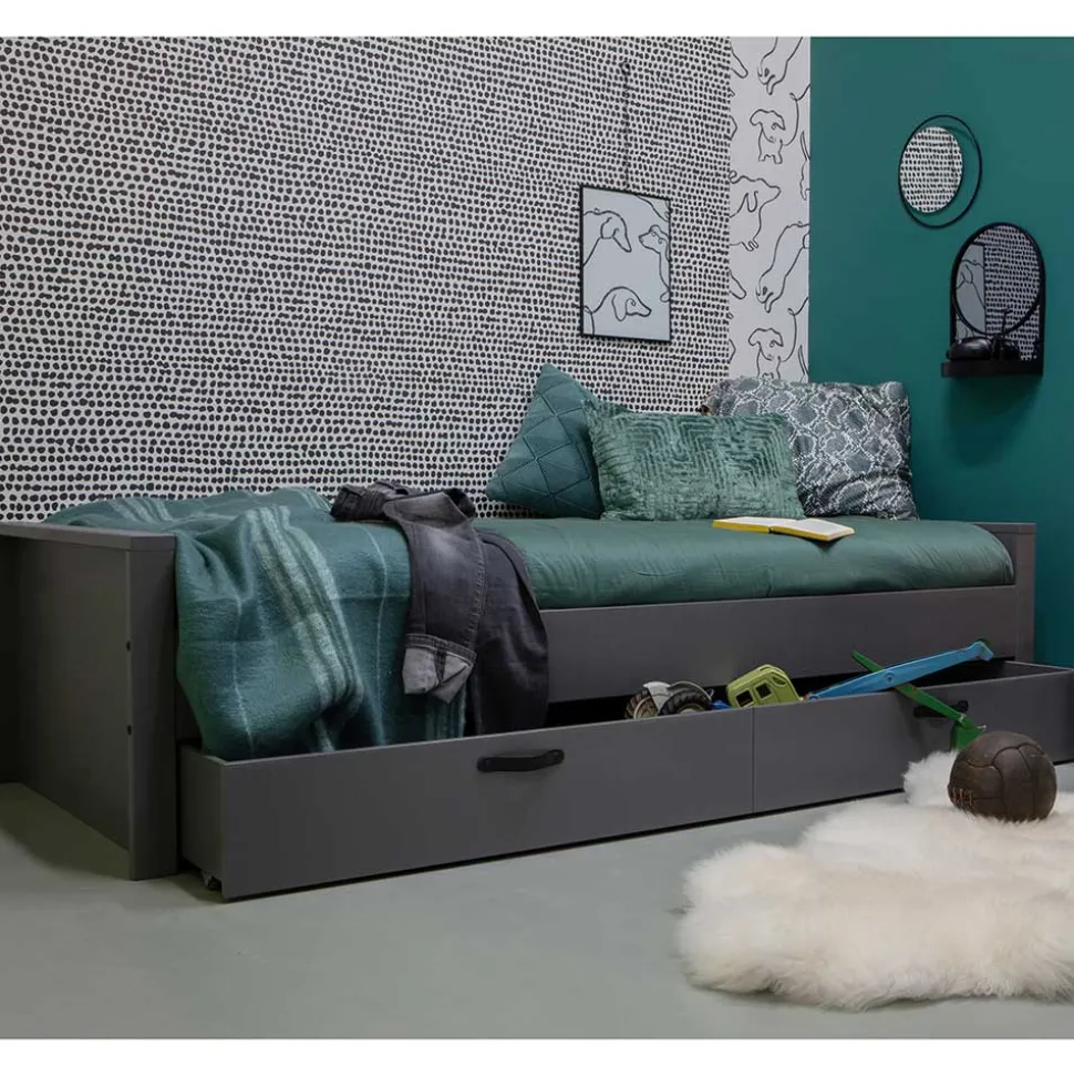 Holzbett „Firgetta“ vereint stilvolle Ästhetik mit funktionaler Qualität. Durch sein puristisches, modernes Design wird es zum Highlight in jedem Jugend- oder Gästezimmer. Die klare Linienführung und die coole Used-Optik passen perfekt in ein modernes Wohnambiente, ohne aufdringlich zu wirken. Dieses Bett überzeugt durch eine graue, lackierte Oberfläche aus massivem Kiefernholz – ein wahres Statement für minimalistischen Stil und hochwertige Handwerkskunst.