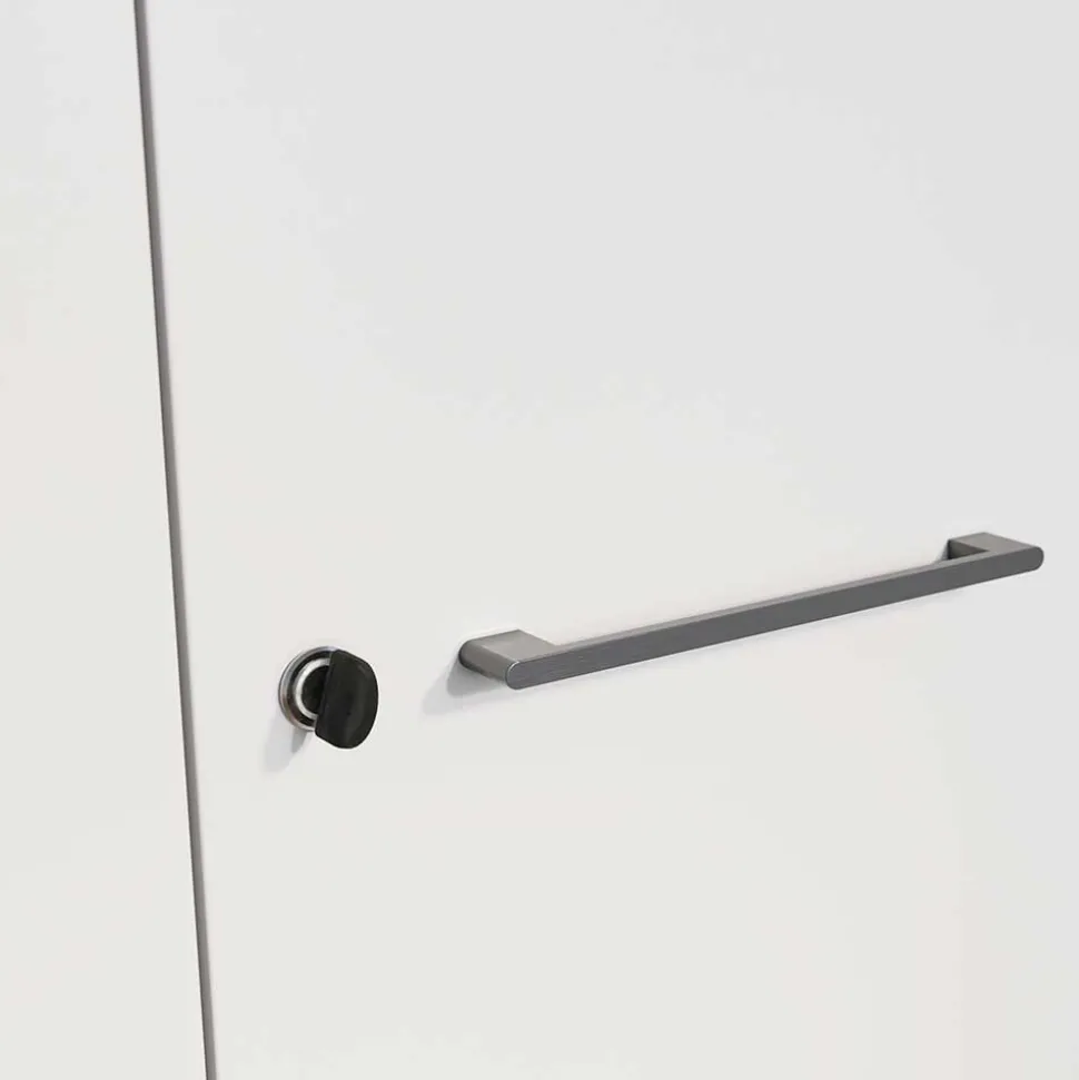 Hinter zwei gedämpften Türen, die sanft und leise schließen, bietet der Schrank großzügigen Stauraum. Die Türen sind mit hochwertigen Metallbeschlägen ausgestattet und lassen sich sicher abschließen – ideal für vertrauliche Unterlagen oder persönliche Gegenstände. Vier höhenverstellbare Einlegeböden schaffen fünf Fächer in praktischer Ordnerhöhe und bieten so maximale Flexibilität für unterschiedlichste Aufbewahrungsbedürfnisse. Jeder Boden trägt bis zu 10 kg, während der stabile Unterboden bis zu 30 kg belastbar ist – perfekt für Bücher, Aktenordner oder schwerere Büroartikel.