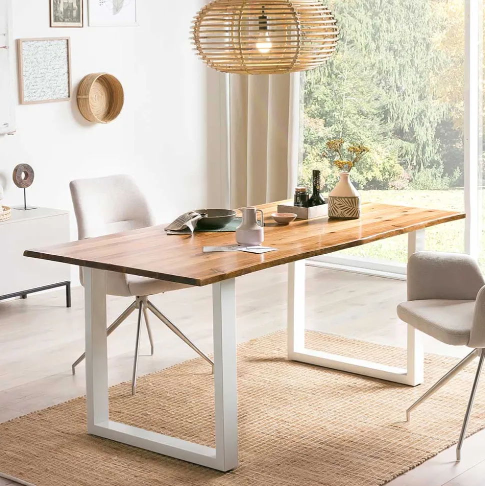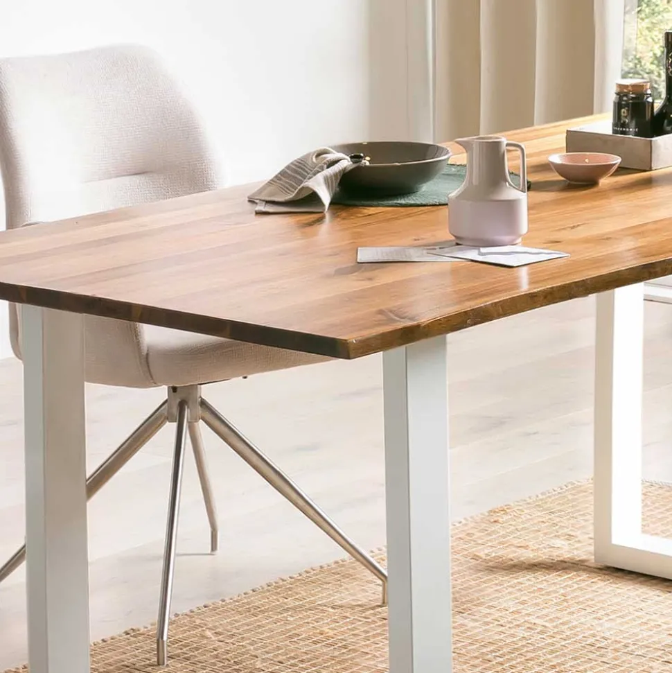 Das weiß lackierte Metall-Bügelgestell in U-Form verleiht dem Tisch nicht nur zusätzliche Stabilität, sondern setzt auch moderne Akzente, die perfekt mit dem robusten Holz harmonieren. Die klare Linienführung des Gestells unterstreicht den minimalistischen Charakter des Tisches und schafft gleichzeitig einen spannenden Kontrast zur natürlichen Holzoptik. So entsteht ein harmonisches Gesamtbild, das sich nahtlos in jede moderne Wohnumgebung einfügt.