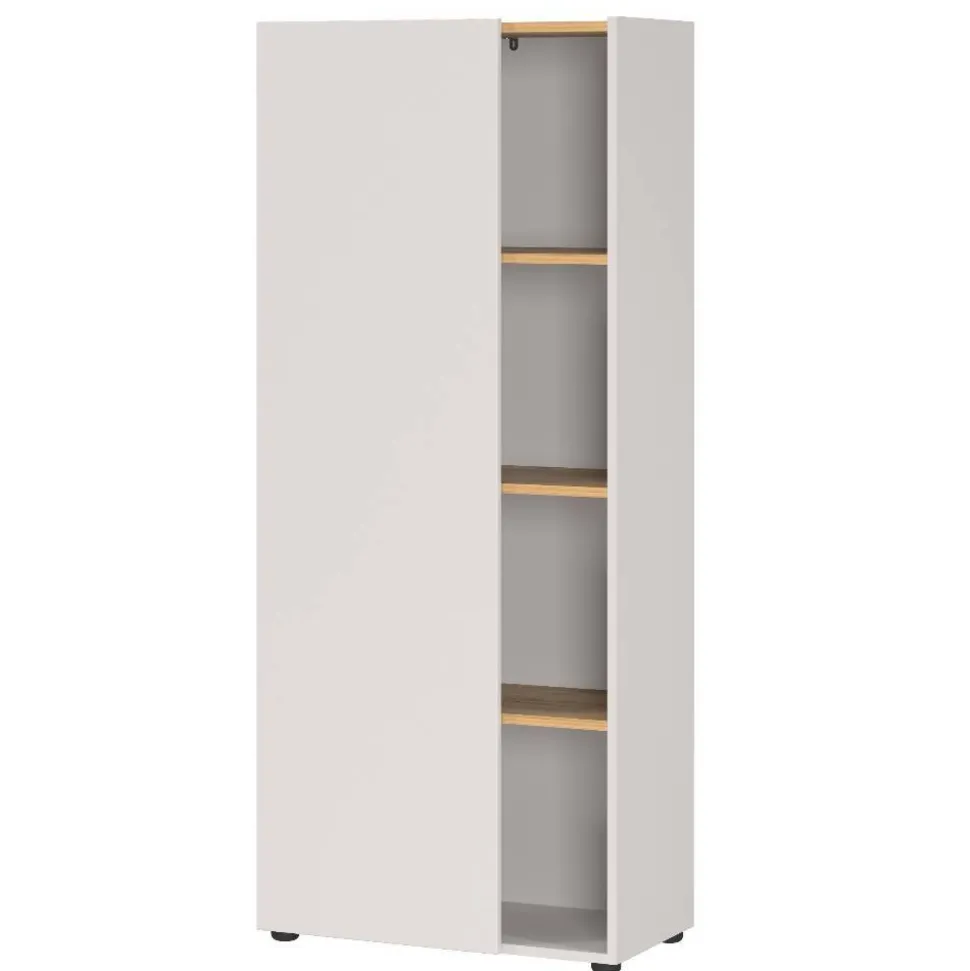 Die grifflos gestaltete Drehtür schließt zu 2/3 und sorgt für eine Mischung aus offenen und verdeckten Ablageflächen. Drei Einlegeböden in Ordnerhöhe ermöglichen eine systematische Aufbewahrung und tragen zur klaren Organisation bei. Ein abgesenkter Oberboden verleiht dem Möbelstück eine moderne Optik.