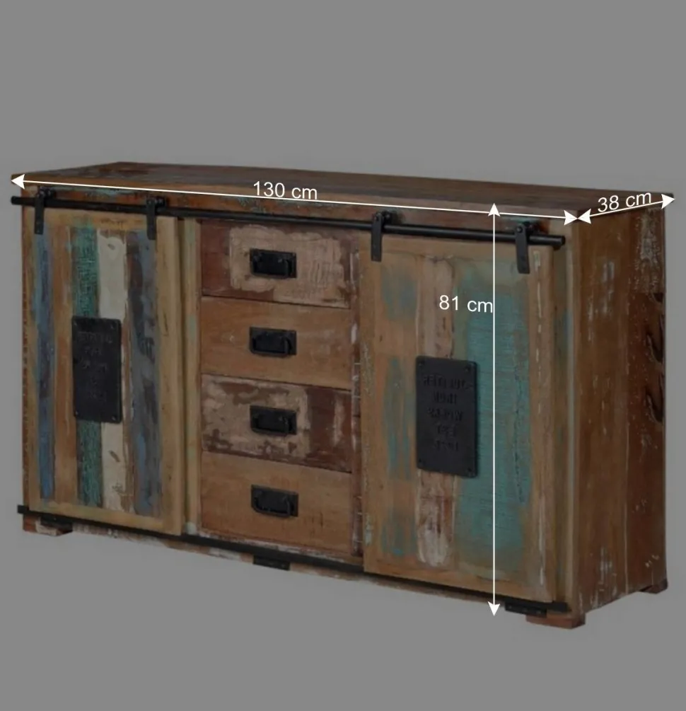 Die Altholz Kombikommode „Jevilia“ vereint rustikalen Charme mit einzigartigem Design. Gefertigt aus wiederverwertetem Holz alter Boote und Möbelstücke, erzählt jedes Exemplar seine eigene Geschichte. Die Oberfläche zeigt bewusst erhaltene Lackreste und Gebrauchsspuren, die dem Möbelstück seine authentische Vintage-Ästhetik verleihen. Durch die individuelle Handarbeit ist jede Kommode ein unverwechselbares Unikat, das Ihrem Wohnraum eine besondere Note verleiht.