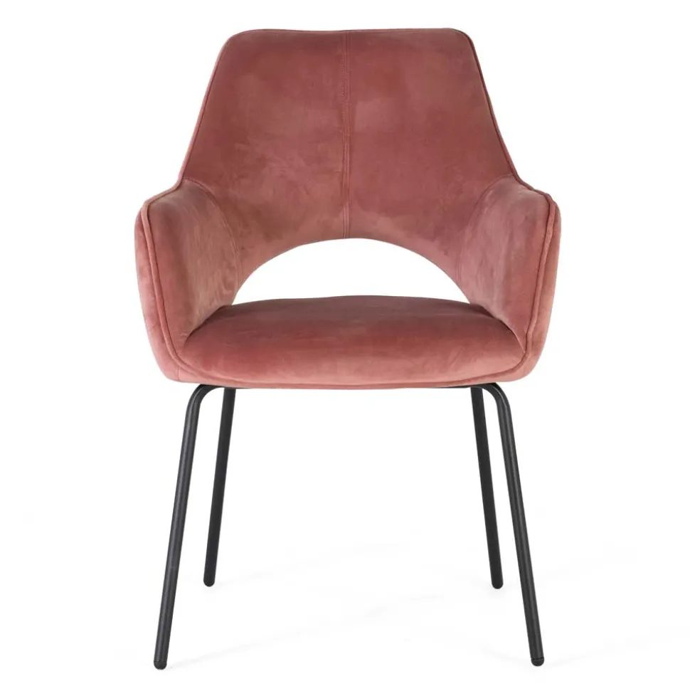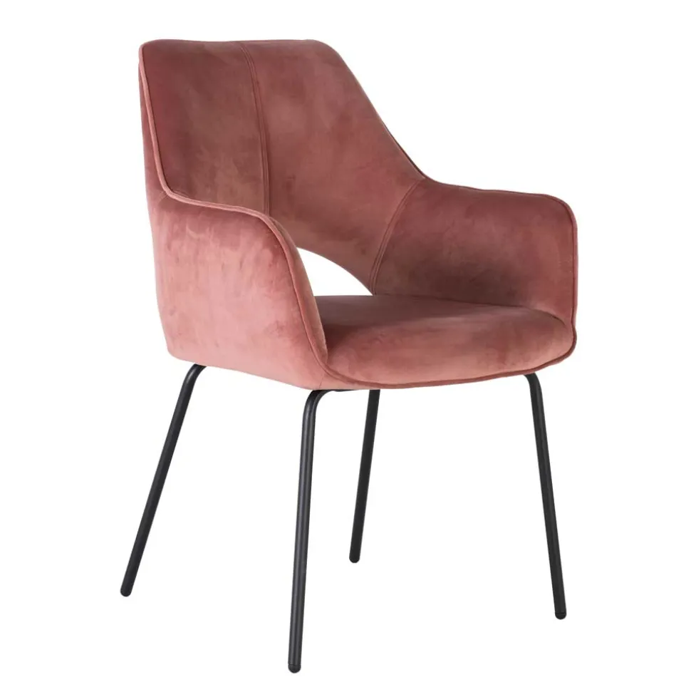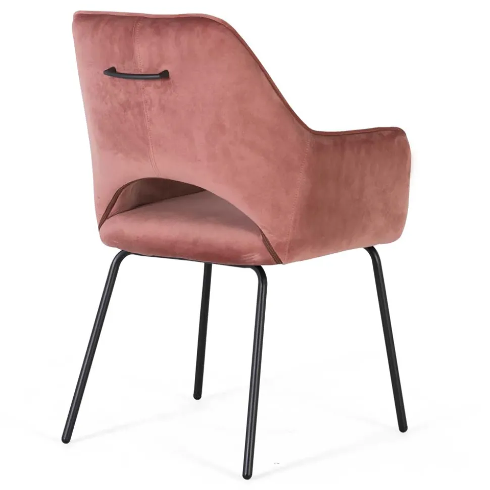 Dieser Armlehnenstuhl ist nicht nur optisch ein Genuss, sondern auch äußerst funktional. Die Rückenlehne ist mit einem Ausschnitt im unteren Bereich versehen, was dem Stuhl eine moderne und durchdachte Ästhetik verleiht. Der praktische Metallgriff an der Rückenlehne erleichtert das Umstellen und Positionieren des Stuhls – so können Sie ihn ganz nach Ihren Wünschen anpassen. Das robuste, schwarze Metall-Vierfußgestell sorgt für Stabilität und Haltbarkeit.