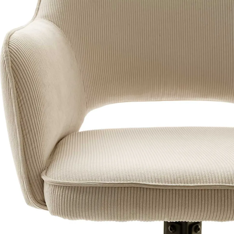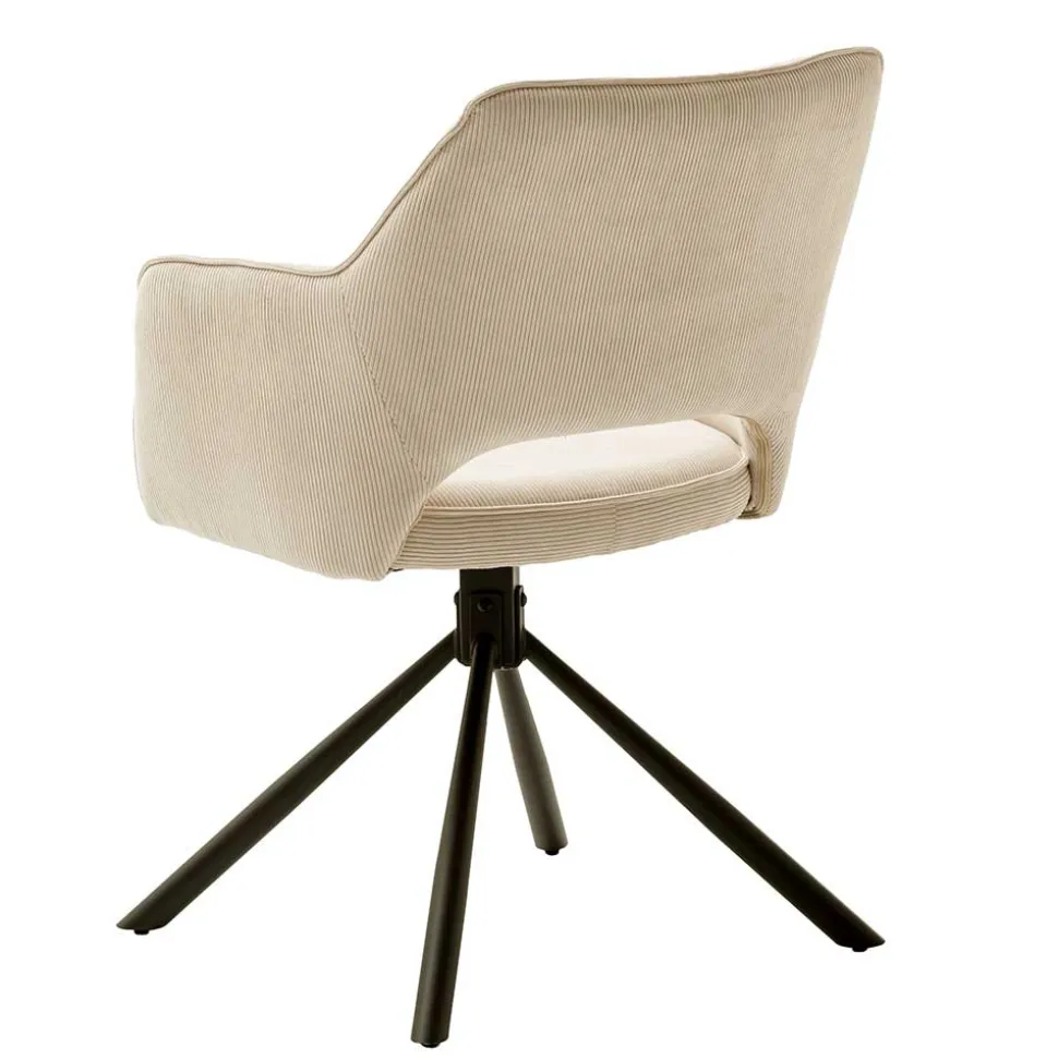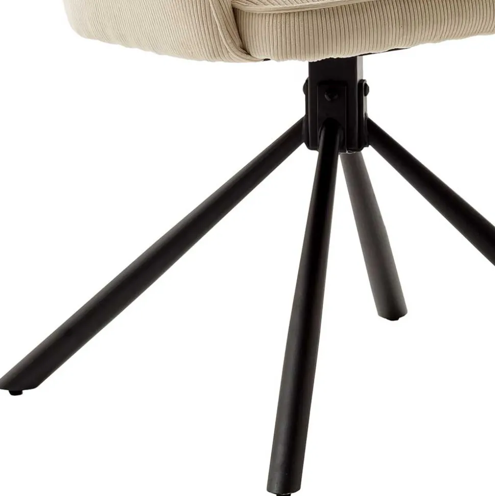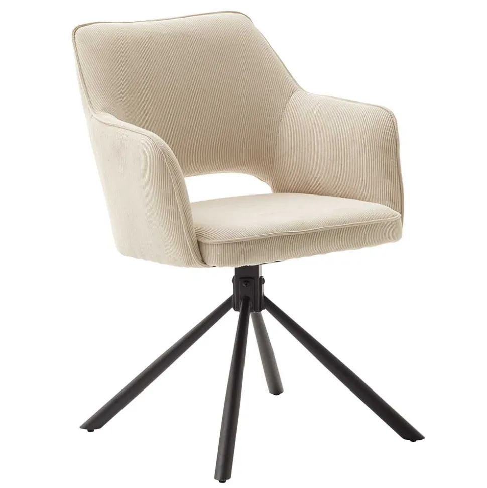 Der Bezug aus strapazierfähigem Cord (100% Polyester) und die komfortable Polsterung aus Schaumstoff machen den „Makimona“ zu einem bequemen Sitzmöbel. Die sachte ausgestellten Armlehnen und die leicht nach hinten geneigte Rückenlehne sorgen für zusätzlichen Komfort und eine harmonische Optik. Das stabile Stativ-Gestell aus robustem Metall in elegantem Mattschwarz verleiht dem Stuhl die nötige Stabilität.