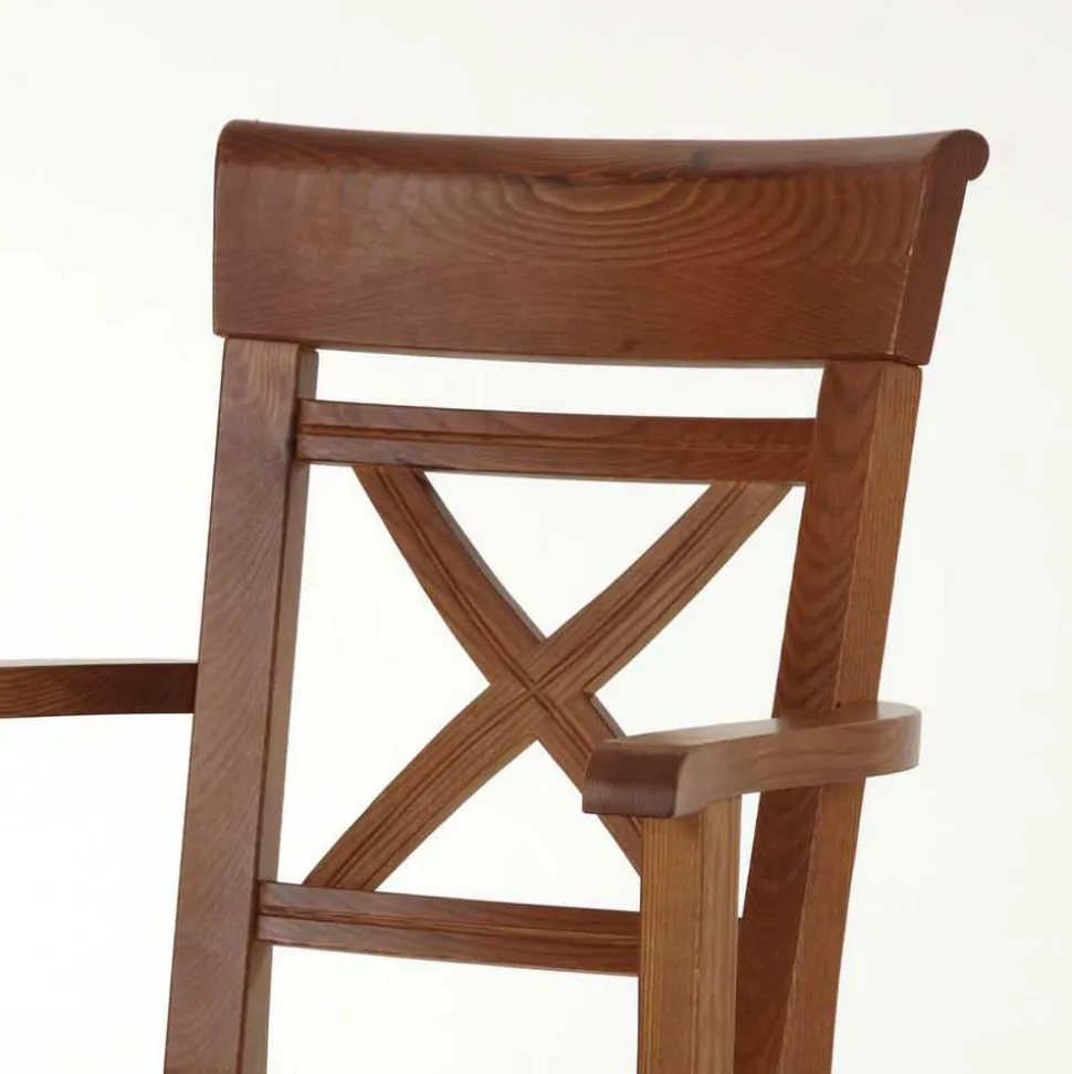 Die Stühle zeichnen sich durch ihr charmant rustikales Design aus, das Gemütlichkeit in jeden Raum bringt. Mit einer Breite von 61 cm, einer Höhe von 94 cm und einer Tiefe von 43 cm bieten sie großzügigen Sitzkomfort. Die Sitzhöhe von ca. 46 cm sowie die Sitztiefe und -breite sind optimal bemessen, um bequemes Sitzen zu ermöglichen. Besonders hervorzuheben sind die bequemen Armlehnen und die stilvoll gestaltete Rückenlehne mit X-förmigen Verstrebungen, die den Stühlen eine besondere Note verleihen.