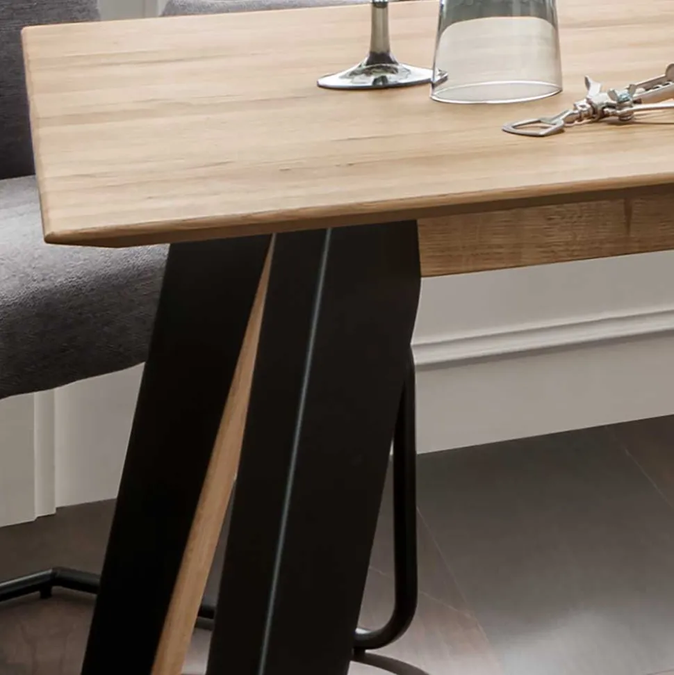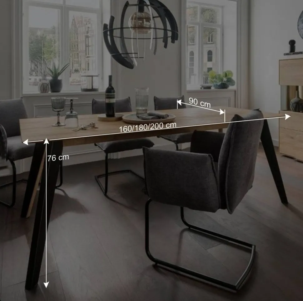 Mit einer Höhe von 76 cm und einer Tiefe von 90 cm ist der Tisch in Breiten von 160 cm, 180 cm oder 200 cm erhältlich. Je nach gewählter Größe bietet er Platz für 6 bis 10 Personen – perfekt für gemütliche Familienessen oder festliche Anlässe. Die solide Tischplatte mit der aufwändig gestalteten Schweizer Kante – eine spezielle Form der Kantenbearbeitung, die Stabilität und Eleganz verbindet – macht den Tisch zum Mittelpunkt jedes Raumes.