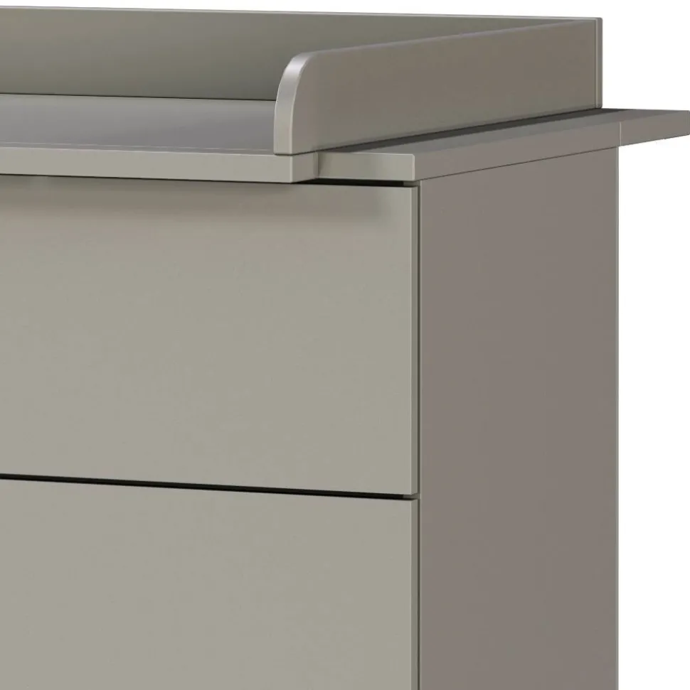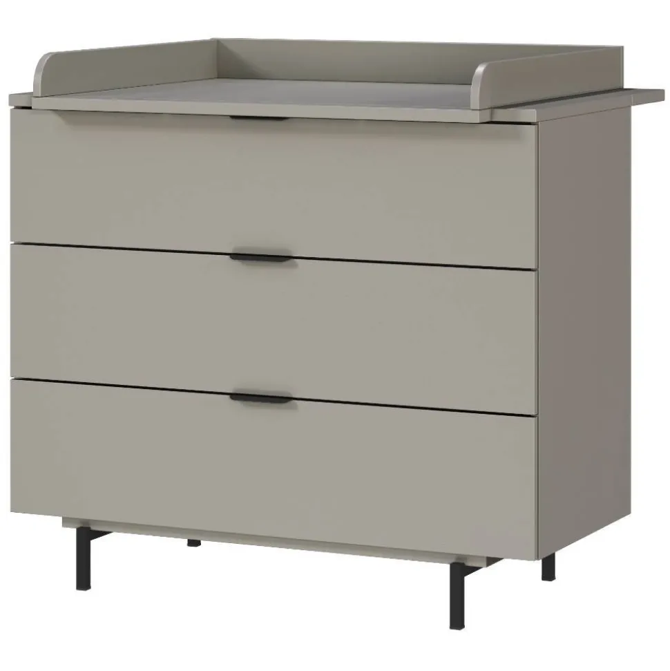 Mit drei geräumigen Schubladen bietet die Kommode reichlich Stauraum für Kleidung, Windeln und Pflegeutensilien. Alle Schubladen sind mit Soft-Close-Funktion ausgestattet, die oberste verfügt darüber hinaus über einen Vollauszug mit Wäscheeinteilung – ideal für strukturierte Ordnung. Die Griffe und Füße aus schwarz pulverbeschichtetem Metall sorgen nicht nur für einen stimmigen Look, sondern auch für solide Stabilität. Der Wickelaufsatz mit dreiseitigem Fallschutz ist bereits im Set enthalten und macht die Kommode zur praktischen Wickelstation. Wird er nicht mehr benötigt, lässt sich der Aufsatz einfach entfernen – die Kommode bleibt weiterhin nutzbar. Die Kommode ist 105 cm breit, 52 cm tief und – inklusive Aufsatz – 103 cm hoch.
