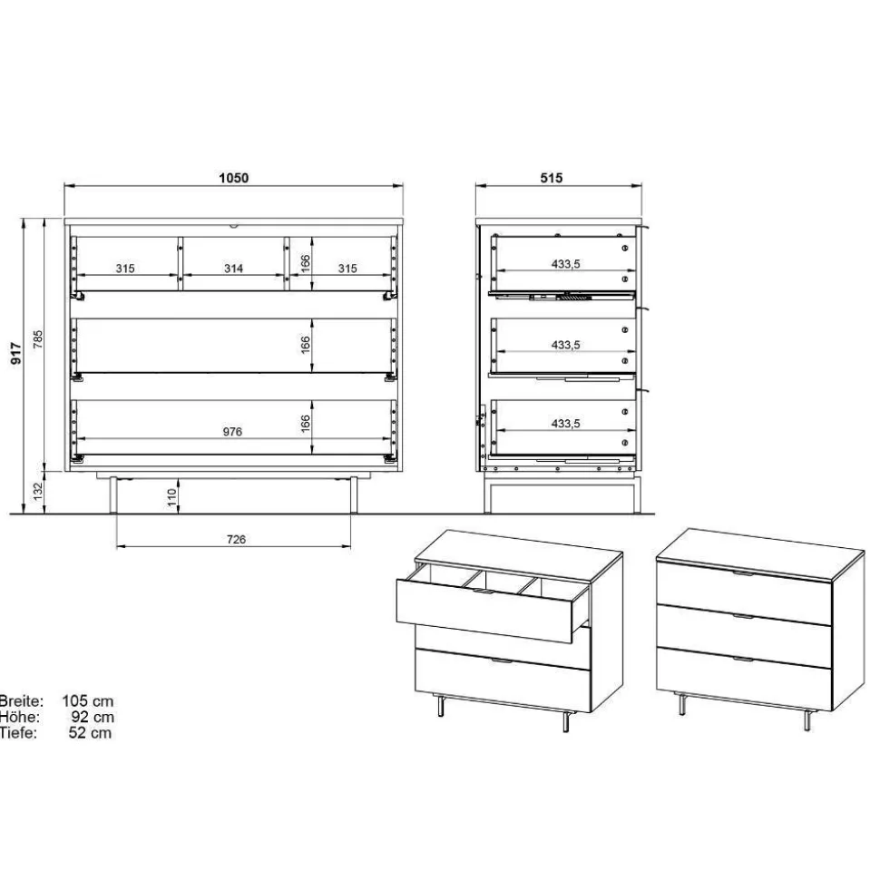 - Der oberste Schubkasten verfügt über einen Vollauszug mit praktischer Wäscheeinteilung