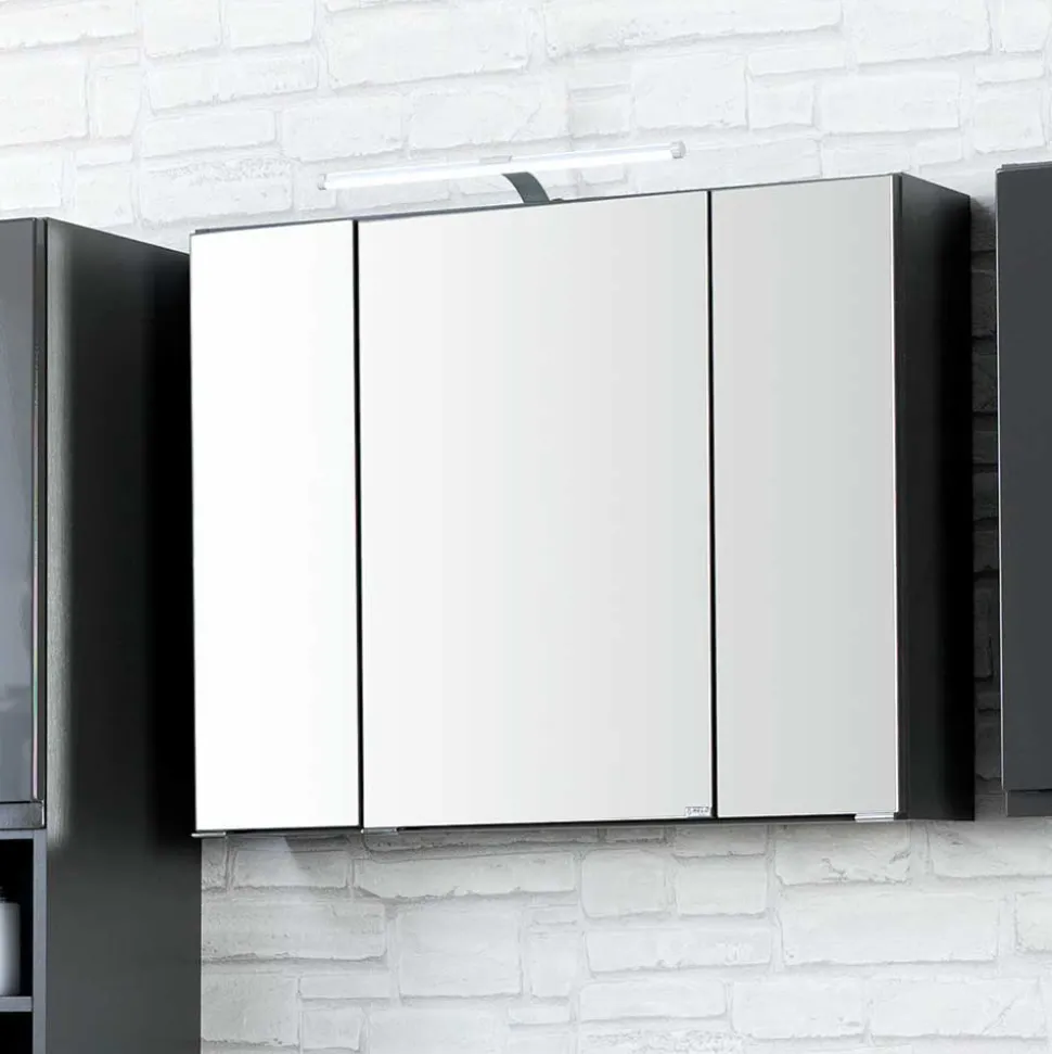 Der Spiegelschrank ist in drei Größen wählbar: 60x64x20 cm, 80x64x20 cm oder 100x64x20 cm ohne Aufbauleuchte. Mit Aufbauleuchte vergrößert sich die Tiefe auf 28 cm bei einer Höhe von 67 cm. Drei komplett verspiegelte Türen lassen das Bad größer wirken und verbergen sechs praktische Glasböden im Inneren. Die integrierte LED-Aufbauleuchte spart Energie (Energieeffizienzklasse LED) und bietet angenehmes Licht. Besonders praktisch: Eine innenliegende Steckdose mit Schalter und Konverter ist bereits eingebaut. Minimalistische Metallgriffe an der Unterkante fügen sich dezent ins Gesamtbild ein.