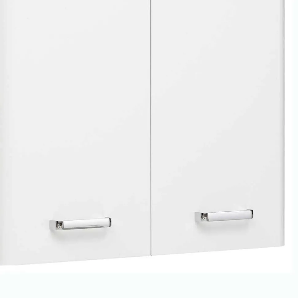 Der Korpus des Badschranks besteht aus einer hochwertigen Spanplatte mit einer robusten Stärke von 1,6 cm. Die weißen Oberflächen sind mit einer schützenden Melaminharzbeschichtung versehen, die den Schrank widerstandsfähig gegenüber Feuchtigkeit und täglichen Gebrauchsspuren macht. Die Front besticht durch ihren tiefgezogenen, hochglänzenden Look, der nicht nur optisch überzeugt, sondern auch pflegeleicht ist. Die stabilen ABS-Kanten sorgen für zusätzlichen Schutz vor Stößen und tragen zur langen Lebensdauer des Schranks bei. Abgerundet wird das Design durch elegante, verchromte Bügelgriffe aus Metall, die eine angenehme Handhabung und stilvolle Optik vereinen.