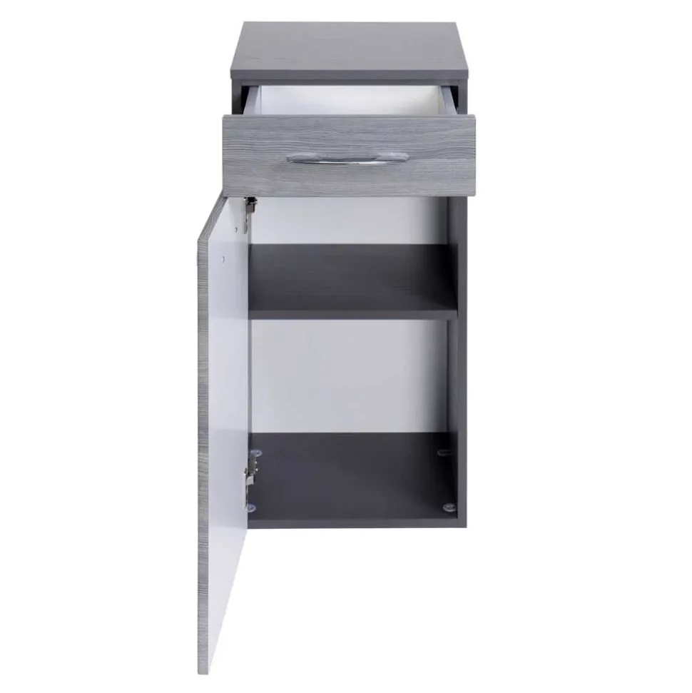 Mit einer Breite von 40 cm, einer Höhe von 79 cm und einer Tiefe von 35 cm passt dieser Unterschrank in nahezu jedes Badezimmer und bietet dennoch reichlich Stauraum. Der Schrank verfügt über eine praktische Drehtür mit beidseitig montierbarem Türanschlag, wodurch Sie ihn flexibel an Ihre Bedürfnisse anpassen können. Die Tür ist mit hochwertigen Soft-Close-Metallbeschlägen ausgestattet, die das sanfte und geräuschlose Schließen ermöglichen – ein Pluspunkt, der den täglichen Komfort deutlich steigert und die Langlebigkeit des Möbels zusätzlich fördert. Innen sorgt ein Einlegeboden für Ordnung und Übersichtlichkeit.