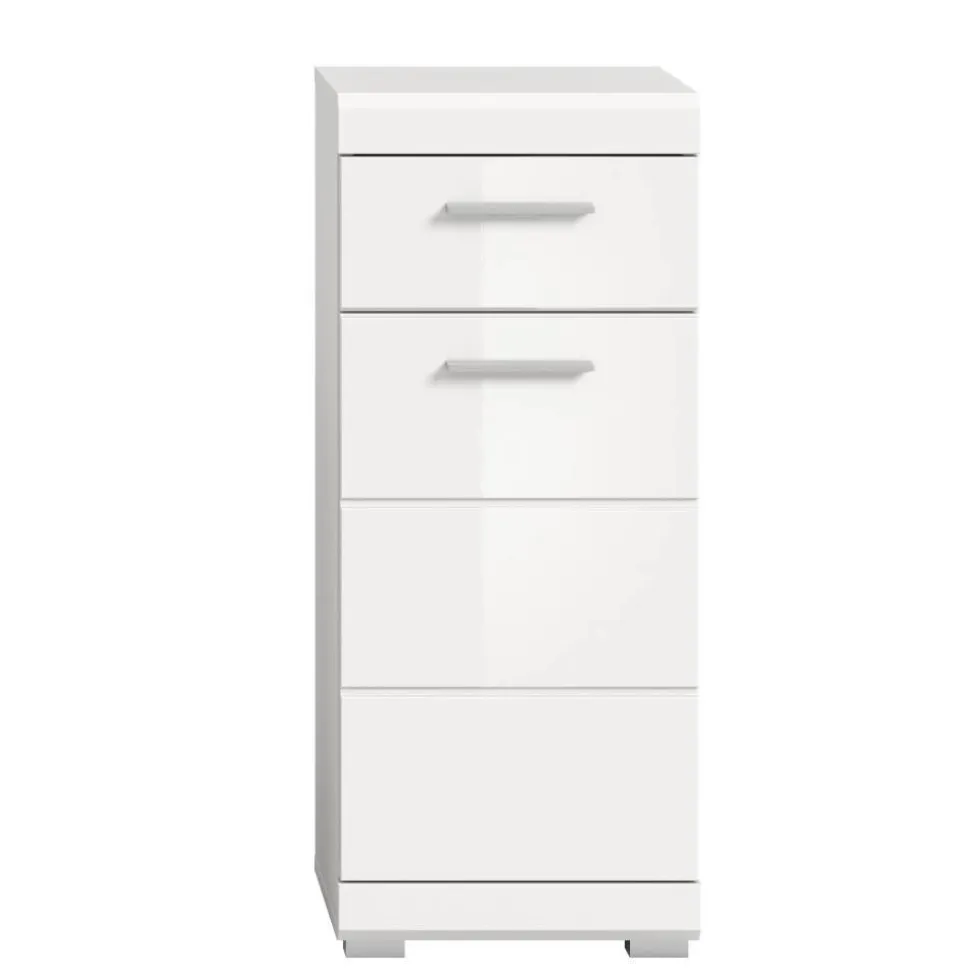 Der Bad-Unterschrank „Henriette“ überzeugt durch modernes Design und clevere Aufteilung. Die weiße Hochglanzfront mit Rillenoptik und silberfarbenen Griffleisten passt harmonisch in jedes Badezimmer und lässt sich ideal mit weiteren Möbelstücken der Serie „Henriette“ kombinieren, die Sie im Wohnen.de Online-Shop entdecken können.