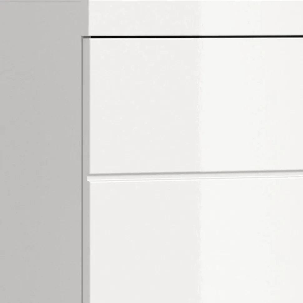 Der Korpus besteht aus robuster Spanplatte, die melaminbeschichtet ist und damit besonders pflegeleicht und feuchtigkeitsbeständig bleibt. Die Front aus MDF ist tiefgezogen foliert, sodass eine glatte, langlebige Hochglanzoberfläche entsteht, die gleichzeitig elegant wirkt.