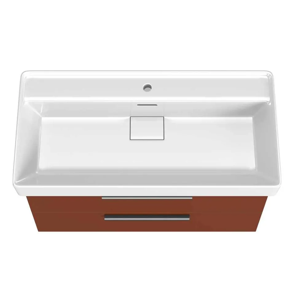 Das weiße Keramik-Einsatzwaschbecken bildet einen perfekten Kontrast zur dunkelroten Oberfläche und punktet mit Pflegeleichtigkeit und Langlebigkeit. Mit seinen Maßen von 99,8 cm Breite, 18,5 cm Höhe und 46,8 cm Tiefe bietet es ausreichend Platz für den täglichen Gebrauch.