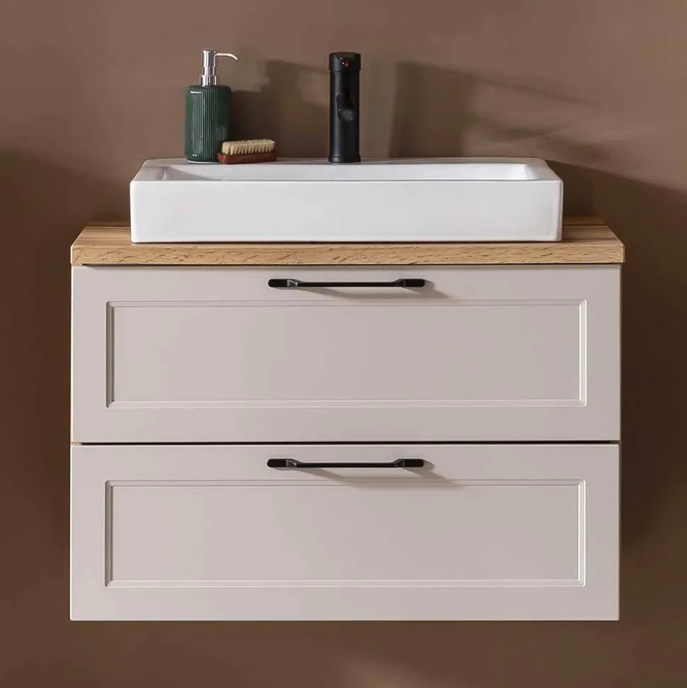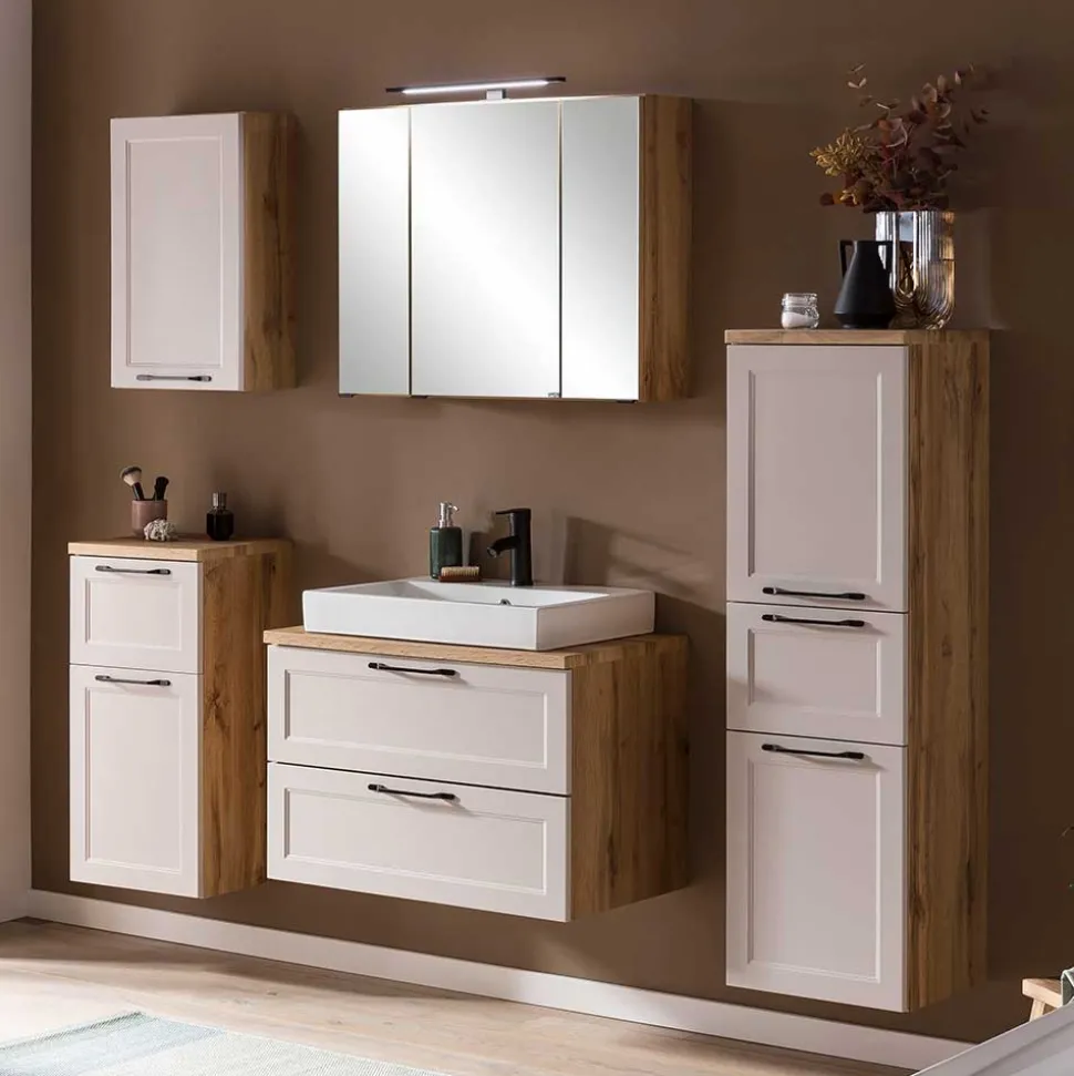 Ein Hauch von ländlicher Gemütlichkeit und gleichzeitig eleganter Stil – das zeichnet den beliebten Landhausstil aus. Trioto interpretiert diesen Stil modern und geschmackvoll: Matt hellgraue Fronten in klassischer Kassettenoptik treffen auf einen Korpus in natürlicher Wildeichefarben-Holzoptik. Diese harmonische Farbkombination verleiht Ihrem Badezimmer eine warme, ruhige Ausstrahlung und sorgt für ein behagliches Wohngefühl, das jeden Morgen verschönert.