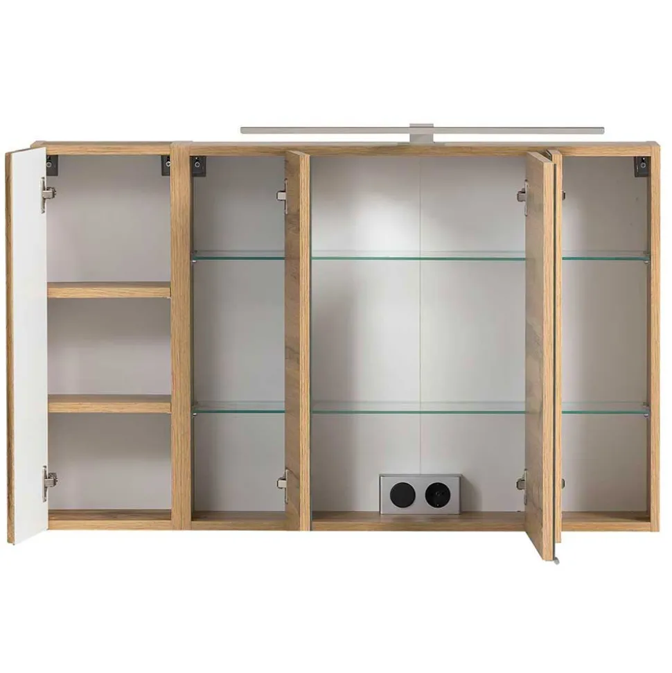Ein großzügiger Spiegelschrank mit vier Türen schenkt nicht nur Spiegelfläche, sondern auch jede Menge Stauraum. Drei Türen sind mit hochwertigem Spiegelglas versehen und verbergen jeweils zwei verstellbare Glasböden, sodass Kosmetik und Pflegeprodukte immer griffbereit und dennoch ordentlich verstaut sind. Hinter der vierten, in Holzoptik gehaltenen Tür warten zwei stabile Einlegeböden aus Holzwerkstoff auf Ihre Badutensilien. Für stimmungsvolle Beleuchtung sorgt die integrierte LED-Leuchte, die mit 60 cm Breite, 4000 Kelvin, 6 Watt und 450 Lumen neutralweißes Licht spendet – ideal für die tägliche Pflege. Dank der Energieeffizienzklasse A bis A++ sparen Sie zusätzlich Strom. Eine integrierte Schalter-Steckdosenkombination rundet den Komfort ab und macht das Stylen oder Rasieren noch praktischer.