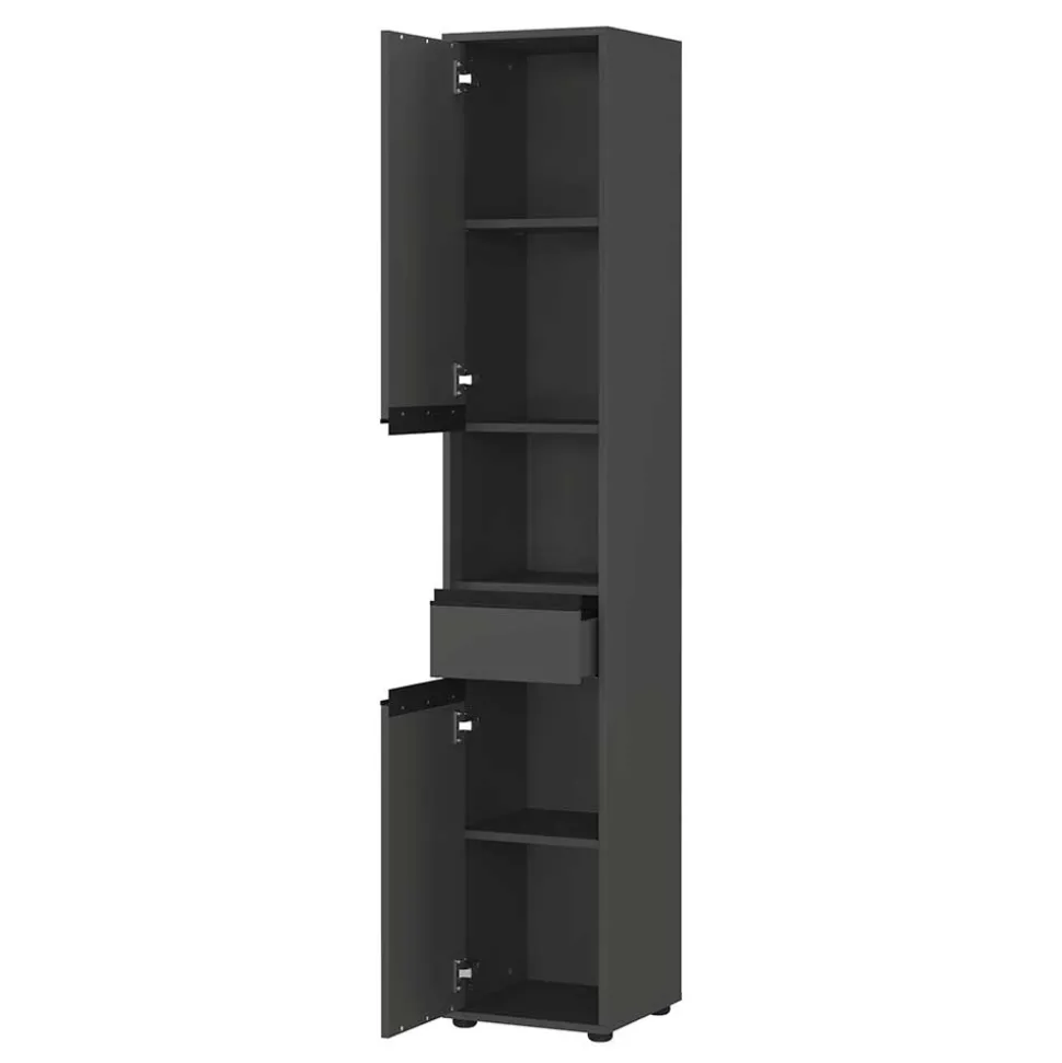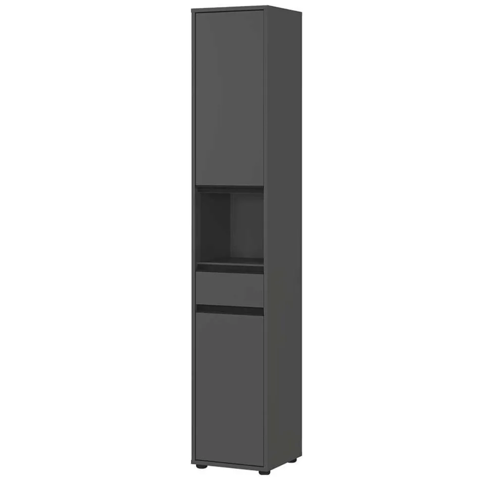 Wer das Badezimmer nicht nur als funktionalen Raum, sondern als Wohlfühloase versteht, wird an diesem Bad Hochschrank „Rufu“ seine Freude haben. Gefertigt in hochwertiger deutscher Produktion, vereint dieses Möbelstück modernes Design mit praktischen Alltagslösungen. Modern bedeutet hier: klare Linienführung, dezente Farbgebung, eine reduzierte Formensprache und intelligente Details, die Komfort und Ästhetik harmonisch vereinen. Genau das bietet dieser attraktive Hochschrank mit Korpus und Fronten in stilvollem Dunkelgrau sowie Griffmulden in edlem Schwarz – ein eleganter Blickfang für jedes Badezimmer.