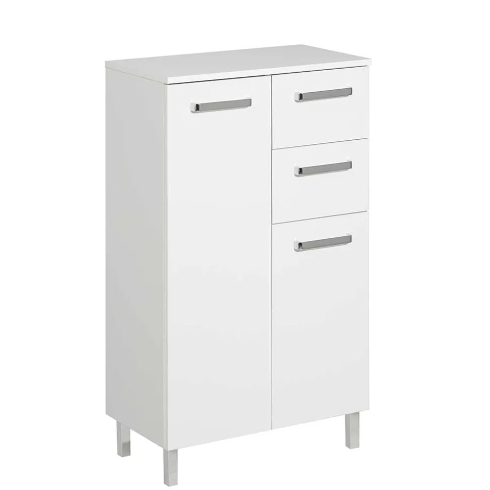 Der „Ardin“ Unterschrank ist aus robuster Spanplatte gefertigt und mit melaminbeschichteten, pflegeleichten Oberflächen versehen. Die glänzende Front strahlt in klassischem Weiß und sorgt für eine makellose Optik. Die ABS-Kanten schützen das Möbelstück vor Stößen und machen es besonders langlebig. Metallene Bügelgriffe in Chrom Glanz und kantige Füße runden das edle Design des „Ardin“ perfekt ab.