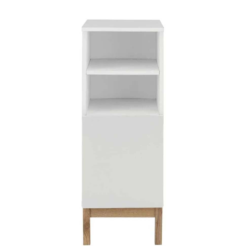 Gefertigt aus robustem Holzwerkstoff, bietet „Speccia“ Langlebigkeit und Stabilität. Die matt folierten Oberflächen in Weiß sind pflegeleicht und kontrastieren elegant mit den Füßen und Akzenten in Holzoptik Wildeiche. Der offene Bereich über der Tür wird durch einen verstellbaren Einlegeboden in zwei praktische Fächer unterteilt – perfekt für die Organisation von kleineren Badezimmerutensilien. Die Drehtür ist mit einer Push-to-open Funktion ausgestattet und kann flexibel mit links- oder rechtsseitigem Türanschlag montiert werden.