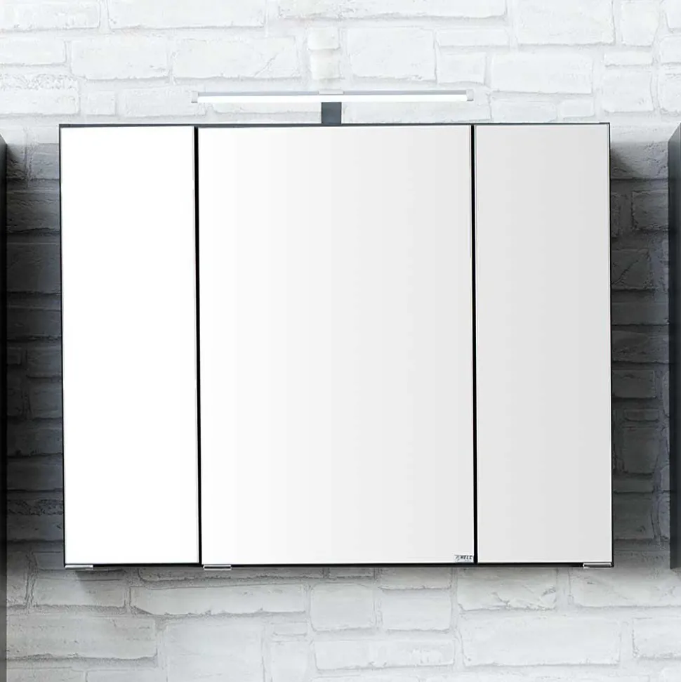 Der Spiegelschrank begeistert nicht nur durch seine drei vollverspiegelten Türen, sondern auch durch seine praktische Innenausstattung. Hinter jeder Tür befinden sich zwei höhenverstellbare Glasböden, insgesamt also sechs Ablageflächen für Kosmetik, Pflegeprodukte und Badutensilien. Eine innenliegende Steckdose, inklusive Konverter und Schalter, bringt modernen Komfort direkt ins Bad. Die Aufbauleuchte mit sparsamer LED-Technik sorgt für energieeffiziente, blendfreie Beleuchtung und unterstreicht die hochwertige Ausstattung.