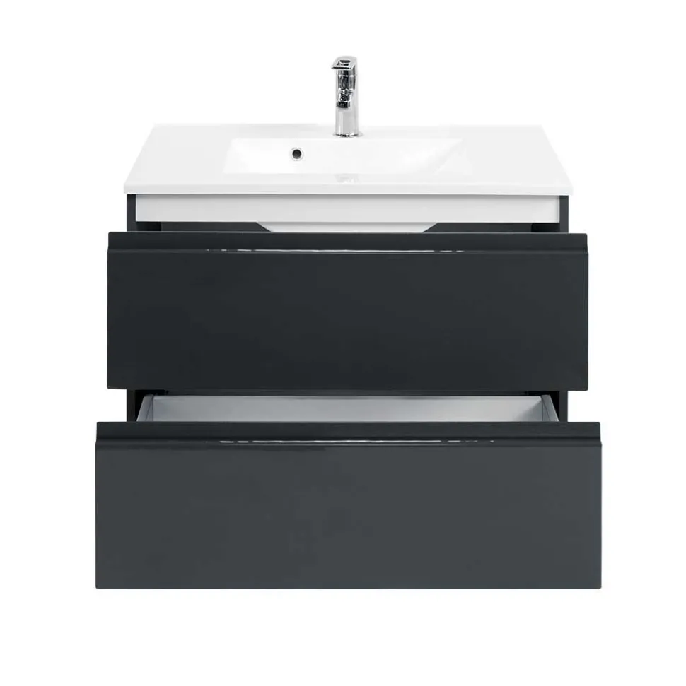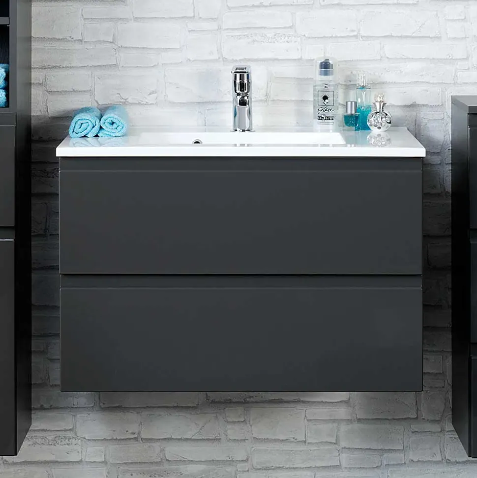 Klare Linien, reduzierte Formen und eine zurückhaltend elegante Farbgebung prägen das Erscheinungsbild dieser Möbel. Die hochglanzveredelten Fronten in edlem Anthrazit setzen luxuriöse Akzente, während der Korpus in matter anthrazitfarbener Melaminbeschichtung für eine stilvolle, moderne Ergänzung sorgt. Melaminbeschichtungen zeichnen sich durch ihre robuste, besonders pflegeleichte Oberfläche aus, die Kratzern und Feuchtigkeit trotzt – ideal also für den täglichen Einsatz im Badezimmer.