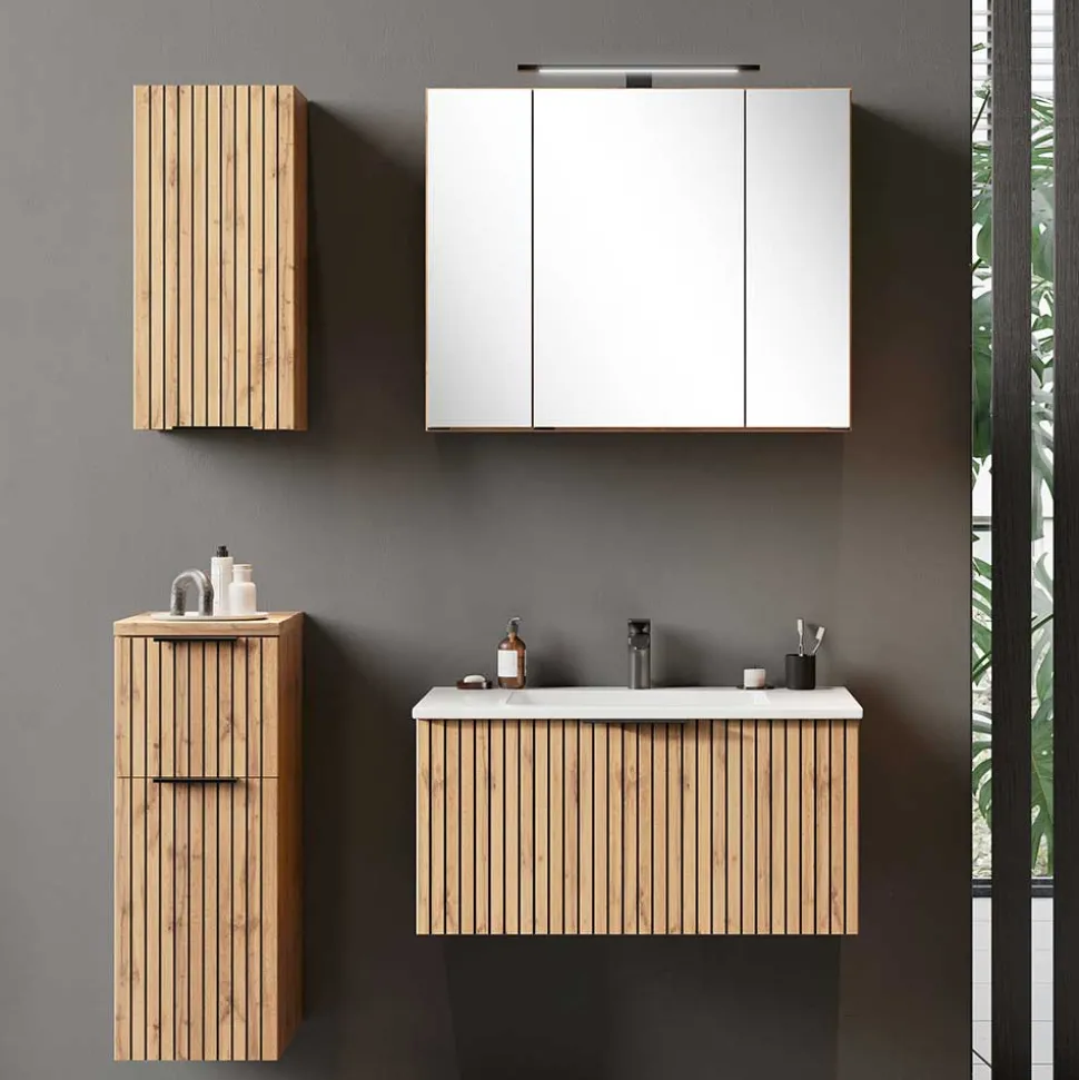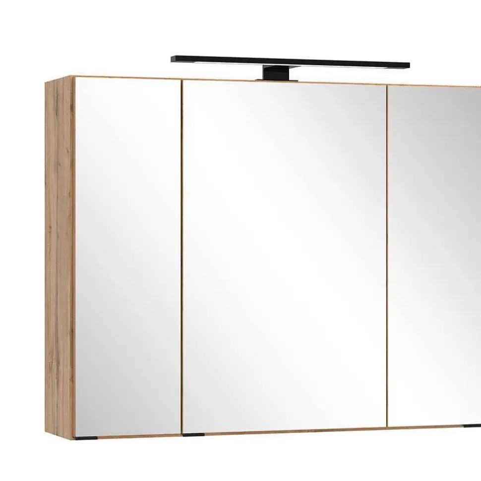 Hergestellt aus hochwertiger Spanplatte und Spiegelglas, überzeugt das Set nicht nur optisch, sondern auch durch seine Alltagstauglichkeit. Die melaminbeschichteten Oberflächen in Wildeiche-Optik sind besonders pflegeleicht, widerstandsfähig gegen Feuchtigkeit und Kratzer – perfekt für den Einsatz im Badezimmer. Die mattschwarz lackierten Metall-Kantengriffe sowie die stabilen Metallbeschläge mit Dämpfung unterstreichen die hohe Materialqualität und sorgen für ein angenehmes Handling im Alltag.