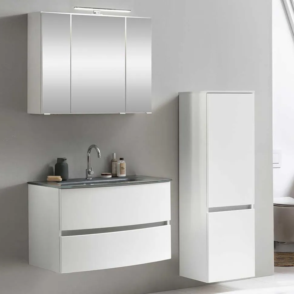 Der Spiegelschrank des Sets zeichnet sich durch seine sparsame LED-Aufsatzleuchte in Chromfarben aus, die Ihr Badezimmer in ein angenehmes Licht taucht. Hinter den drei Türen verbergen sich verstellbare Glasböden, die genügend Platz für all Ihre Badutensilien bieten. Die integrierte Trafobox mit Lichtschalter und Steckdose macht diesen Schrank nicht nur optisch ansprechend, sondern auch äußerst praktisch.