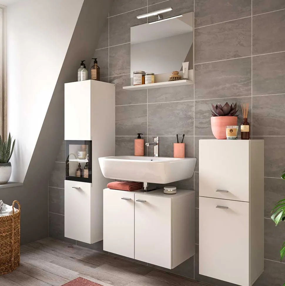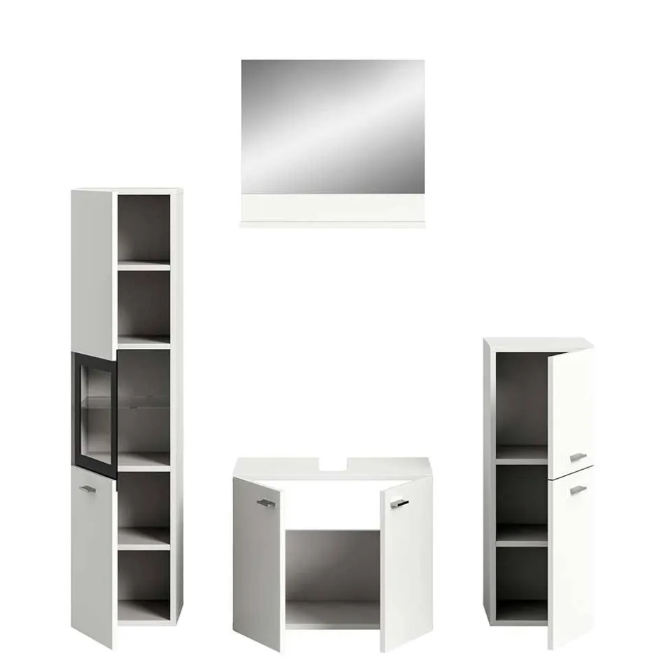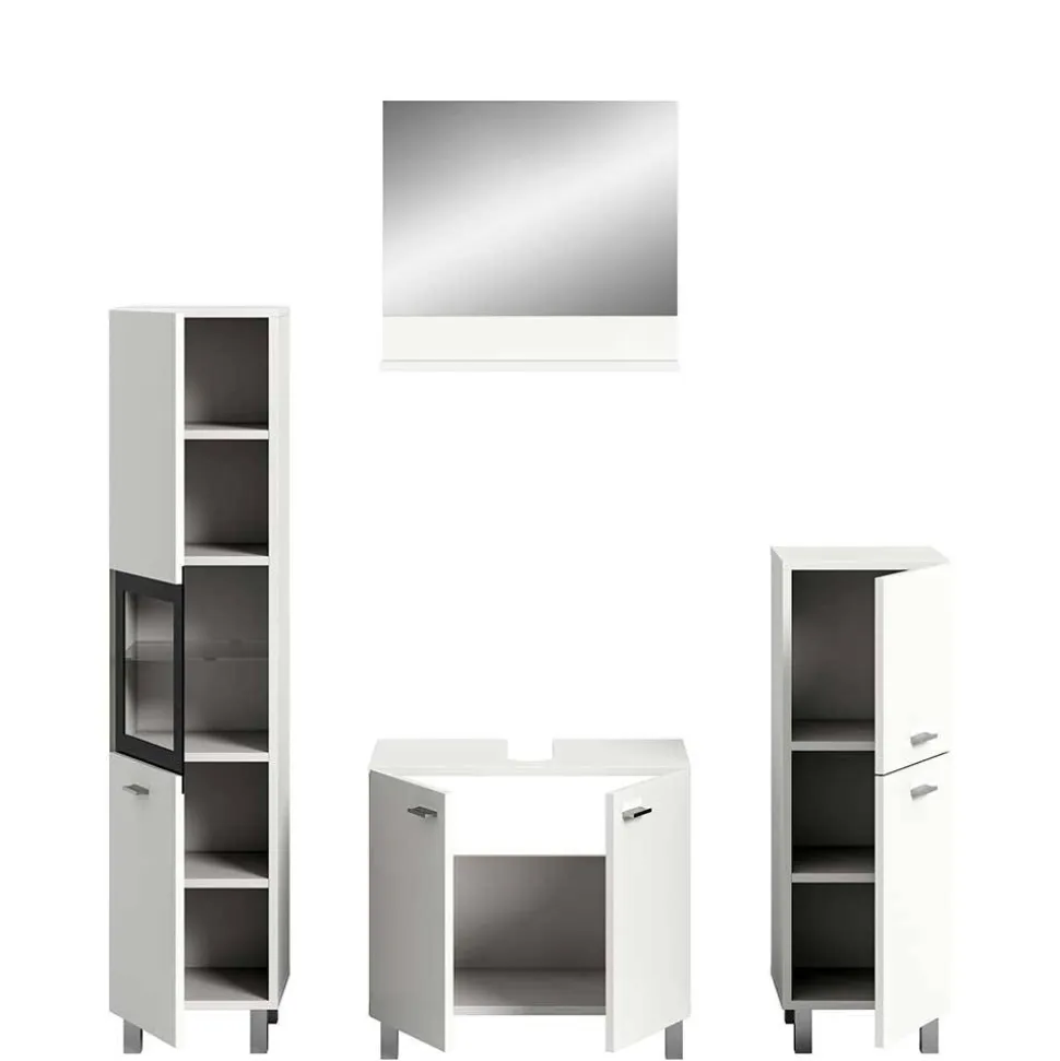 Die Badmöbel-Kombi „Harmone“ verbindet stilvolles Design mit praktischer Funktionalität und schafft ein harmonisches Gesamtbild im Badezimmer. Dieses vierteilige Set in Weiß bietet eine zeitgemäße Lösung mit großzügigem Stauraum und hochwertigen Materialien.