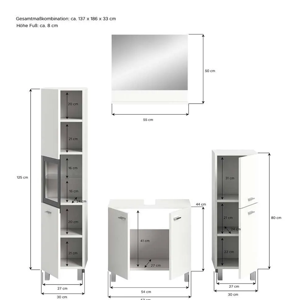 Mit Maßen von 30x125x29 cm bietet der Midischrank ausreichend Platz für Badeutensilien. Die Drehtür mit schwarz eingerahmtem Glaseinsatz sorgt für eine stilvolle Optik. Innen befinden sich zwei Einlegeböden, ein Glasboden und zwei Konstruktionsböden für eine individuelle Stauraumlösung. Die Höhe mit Füßen beträgt 133 cm.