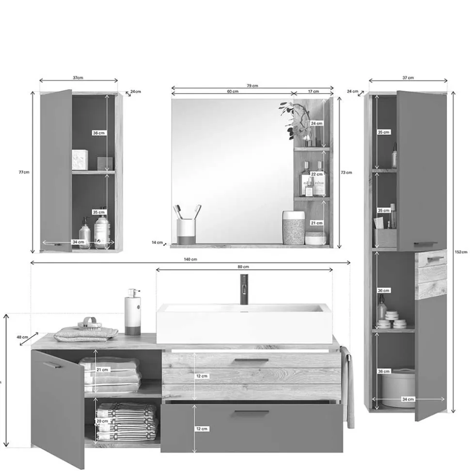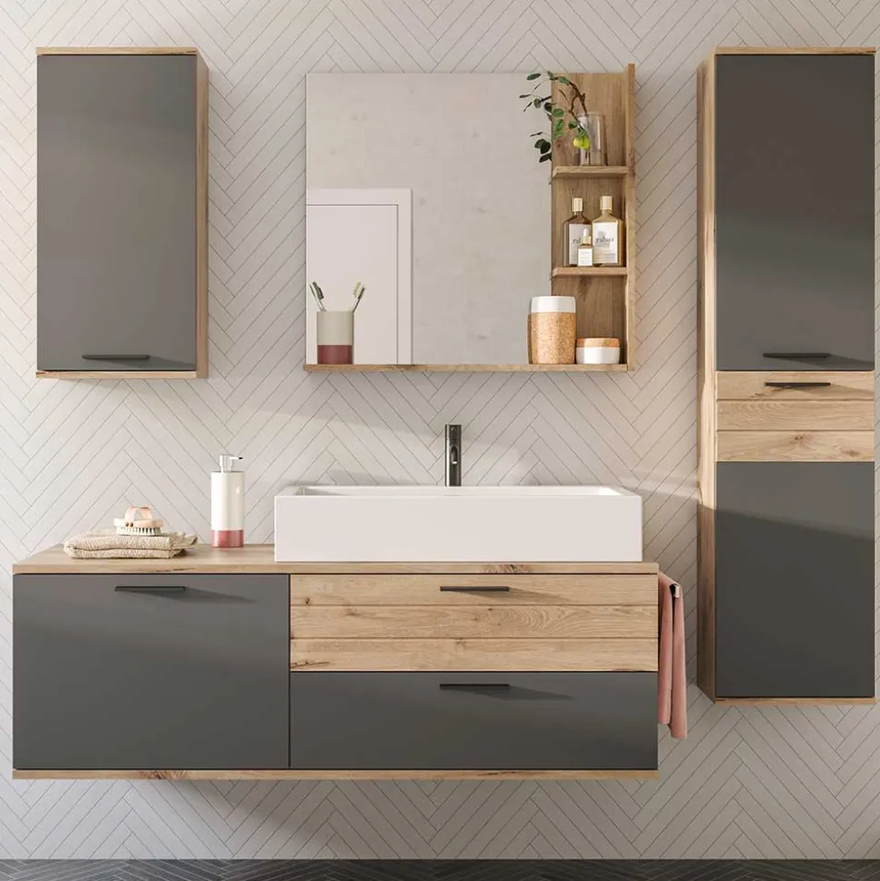 Dieses vierteilige Set bietet Ihnen alles, was ein gut organisiertes Badezimmer benötigt: Midischrank, Oberschrank, Waschtisch mit Aufsatzbecken und Spiegel. Alle Elemente sind für die platzsparende Wandmontage konzipiert, was Ihrem Bad eine moderne, schwebende Optik verleiht und zugleich die Bodenreinigung erleichtert.
