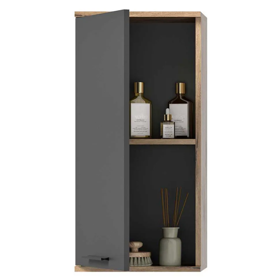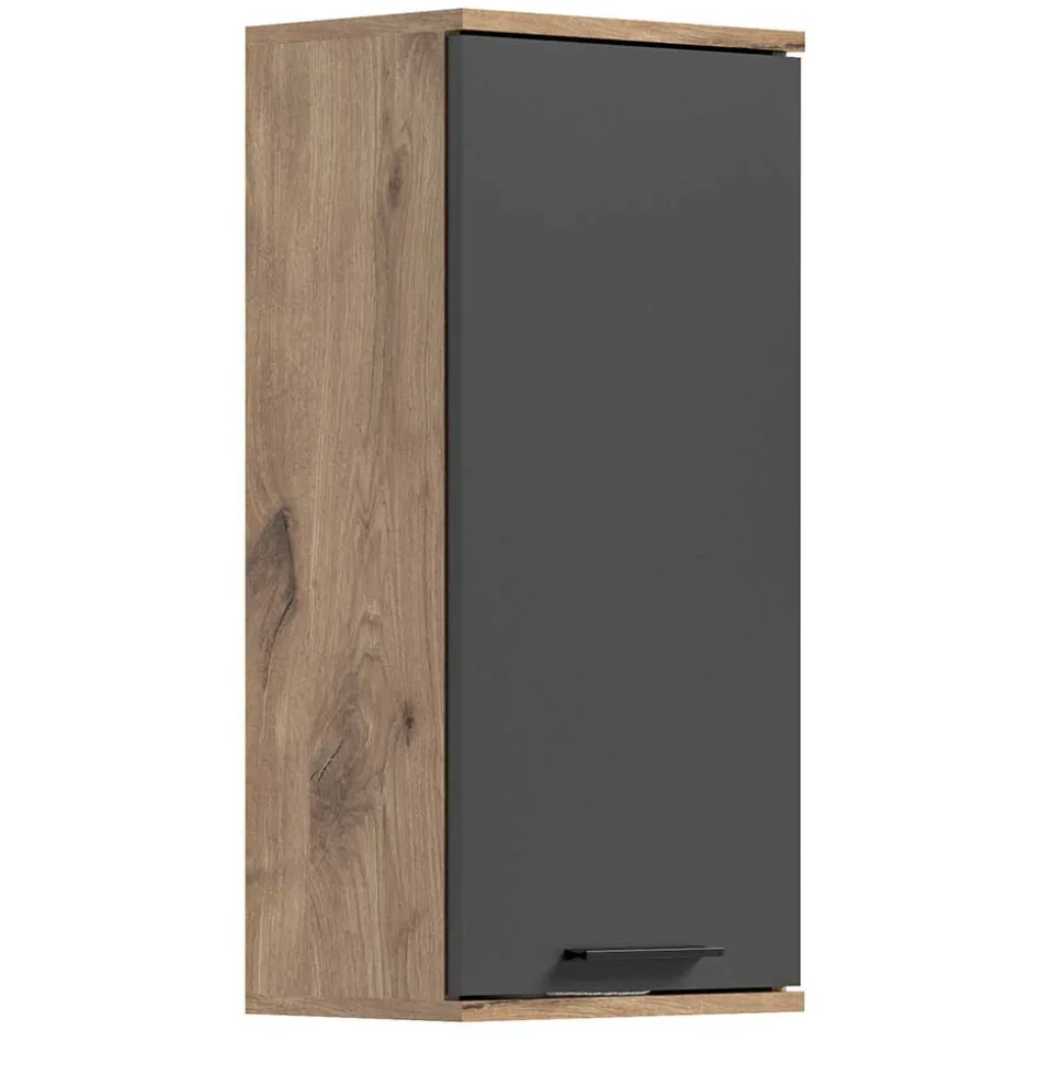 Im Oberschrank (B/H/T: 37x77x24 cm) findet sich hinter einer Tür ein verstellbarer Einlegeboden, der für flexible Stauraumlösungen sorgt.