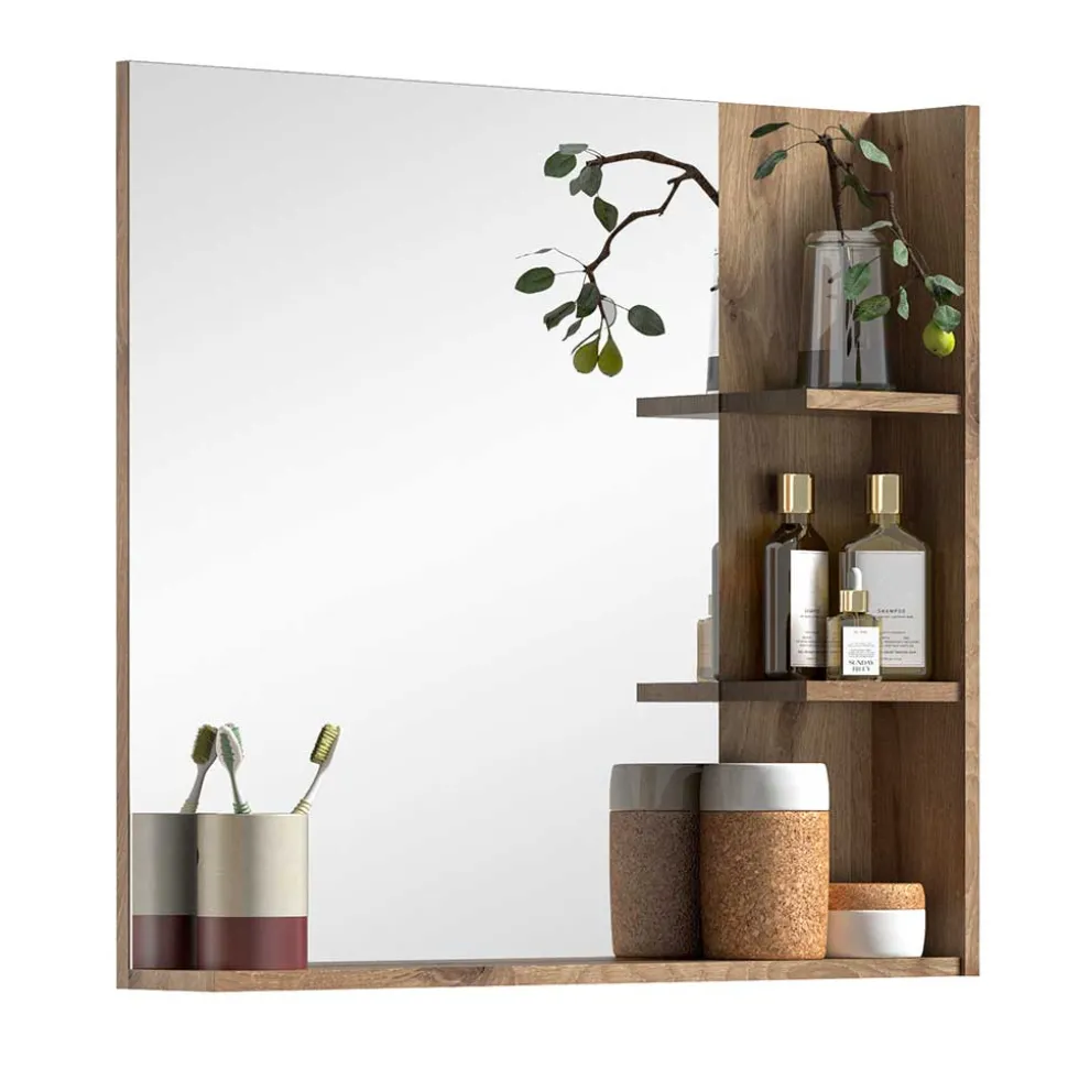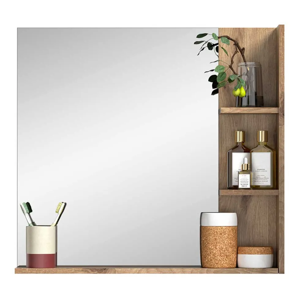Der Spiegel (B/H/T: 79x73x14 cm) überzeugt mit cleverem Stauraum: Neben der großzügigen Spiegelfläche (60×73 cm) befindet sich rechts ein tief geführter Rahmen mit einer breiten Ablagefläche darunter sowie ein seitliches Regal mit zwei Einlegeböden, jeweils mit einer Belastbarkeit von 2 kg. Der Spiegel kann nur in der dargestellten Aufbauweise montiert werden.