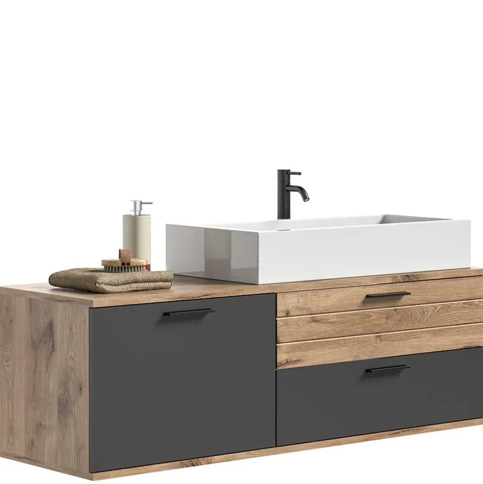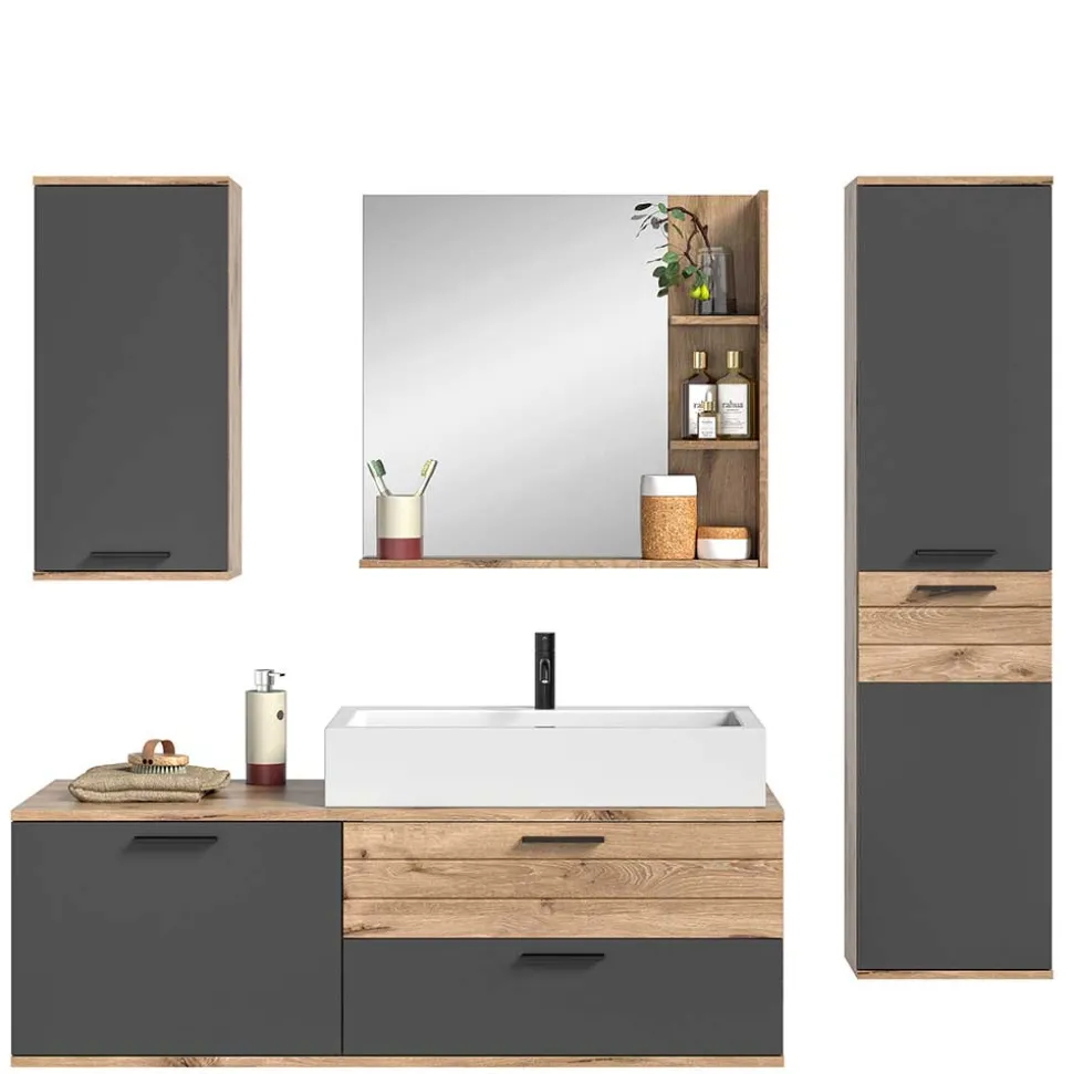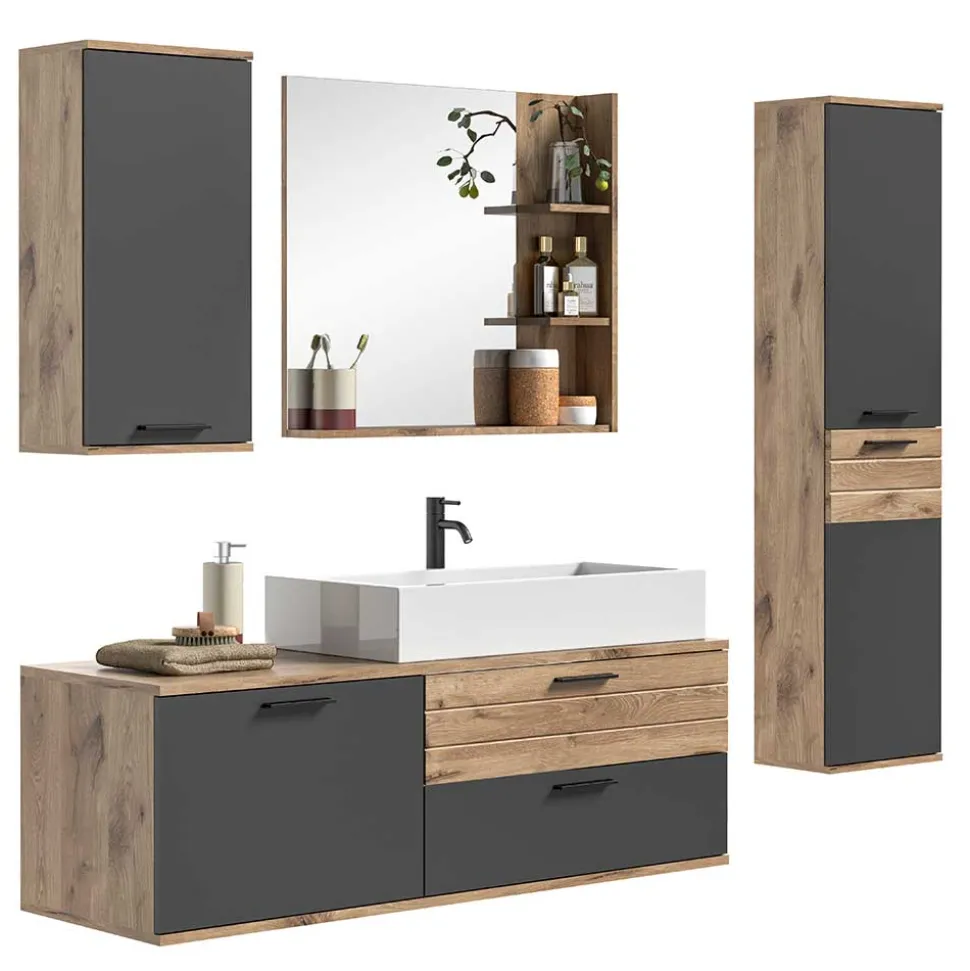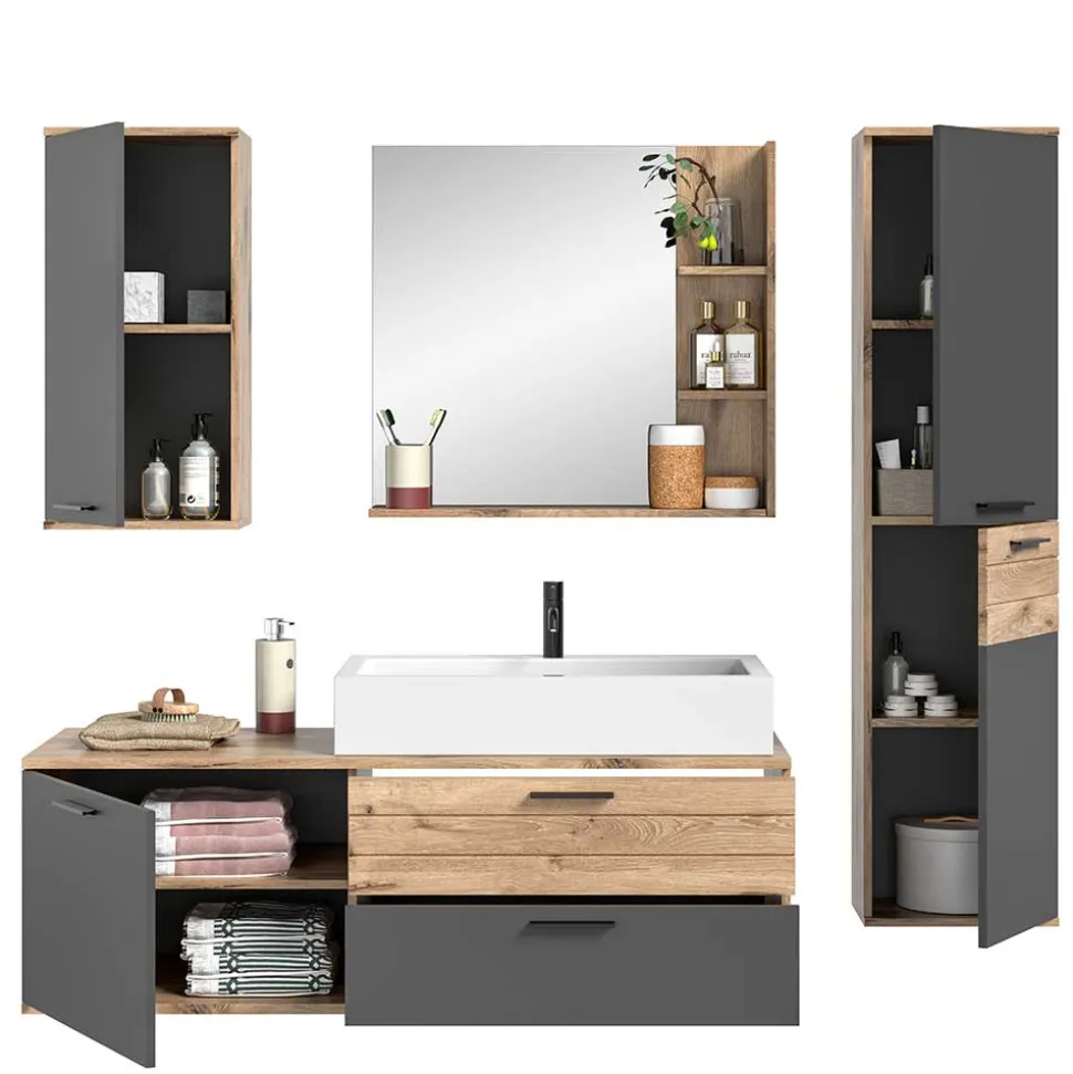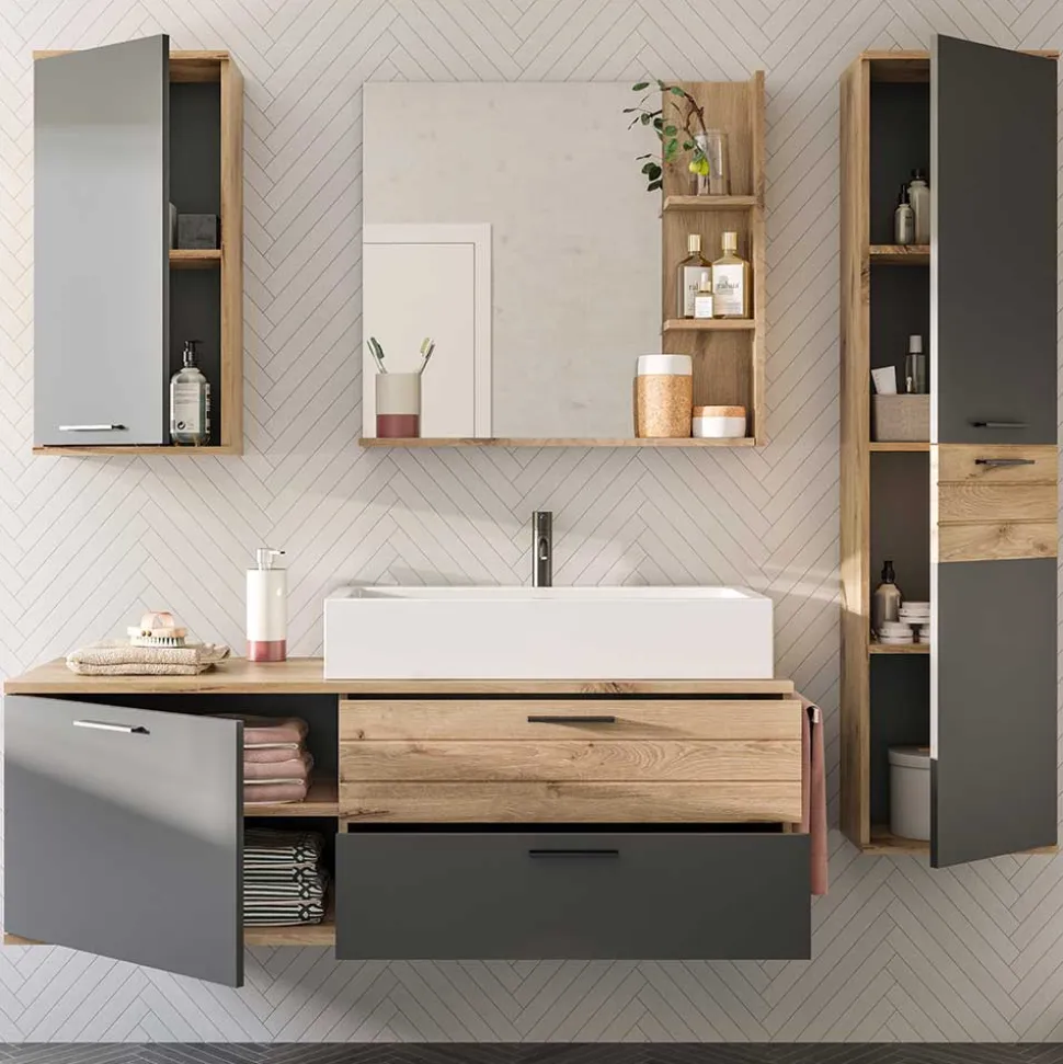 - Kontraststarke Badmöbel in Wildeichefarben und Grau