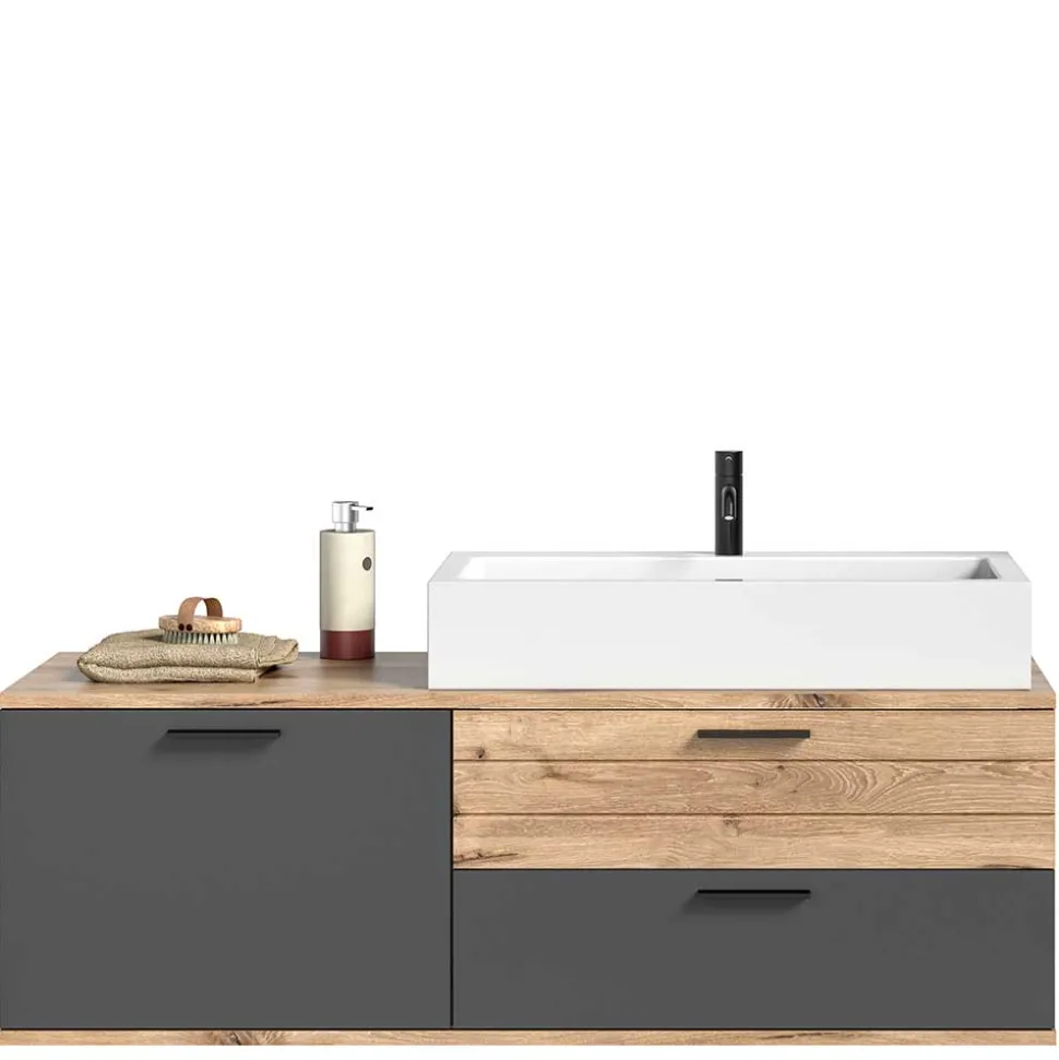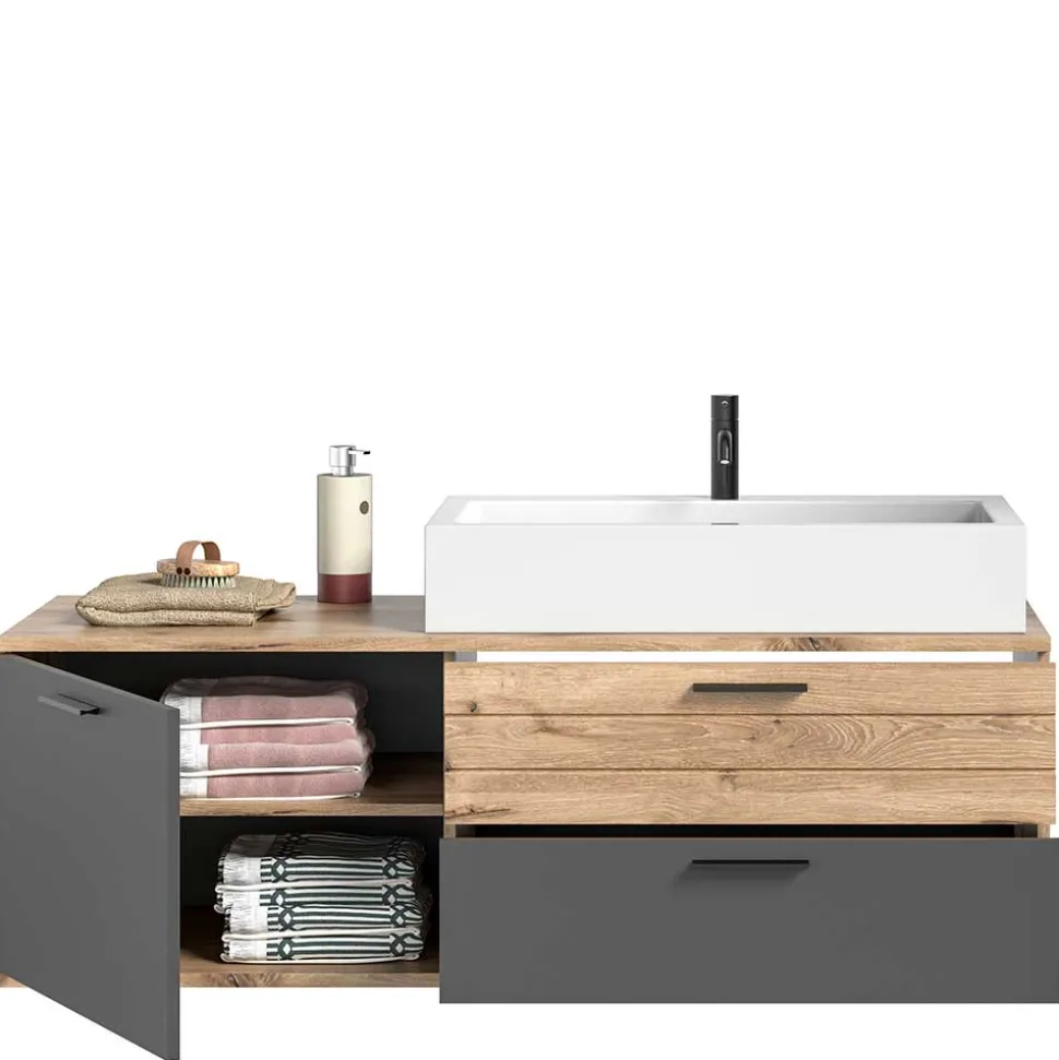 Das Herzstück dieses Sets bildet der großzügige Waschtisch (B/H/T: 140x62x48 cm) mit einem formschönen Aufsatzbecken (B/H/T: 80×14,6×43,3 cm). Bitte beachten Sie: Die Lieferung erfolgt ohne Armaturen. Links bietet eine Tür mit verstellbarem Einlegeboden praktischen Stauraum, während rechts zwei Schubladen mit stabilen Metall-Vollauszügen (Innenmaße je ca. 72,5x7x23,5 cm) für Ordnung sorgen. Ein vorgefertigter Siphonausschnitt in der Deckplatte sowie eine teilgeöffnete Rückwand hinter den Schubladen erleichtern die Installation erheblich.
