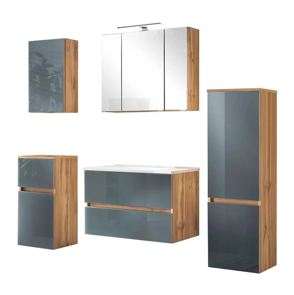 Das Design der Serie Anviletca verkörpert moderne Wohnästhetik auf höchstem Niveau. Die Kombination aus sanftem Grau und der warmen Wildeiche-Holzoptik sorgt für ein harmonisches Zusammenspiel von urbaner Klarheit und natürlicher Gemütlichkeit. Während das dezente Grau Ruhe und Eleganz ausstrahlt, bringt die melaminbeschichtete Oberfläche in Wildeiche-Farbton einen Hauch von Natürlichkeit in den Raum – perfekt, um ein Badezimmer in einen Ort des Wohlbefindens und der Entspannung zu verwandeln.