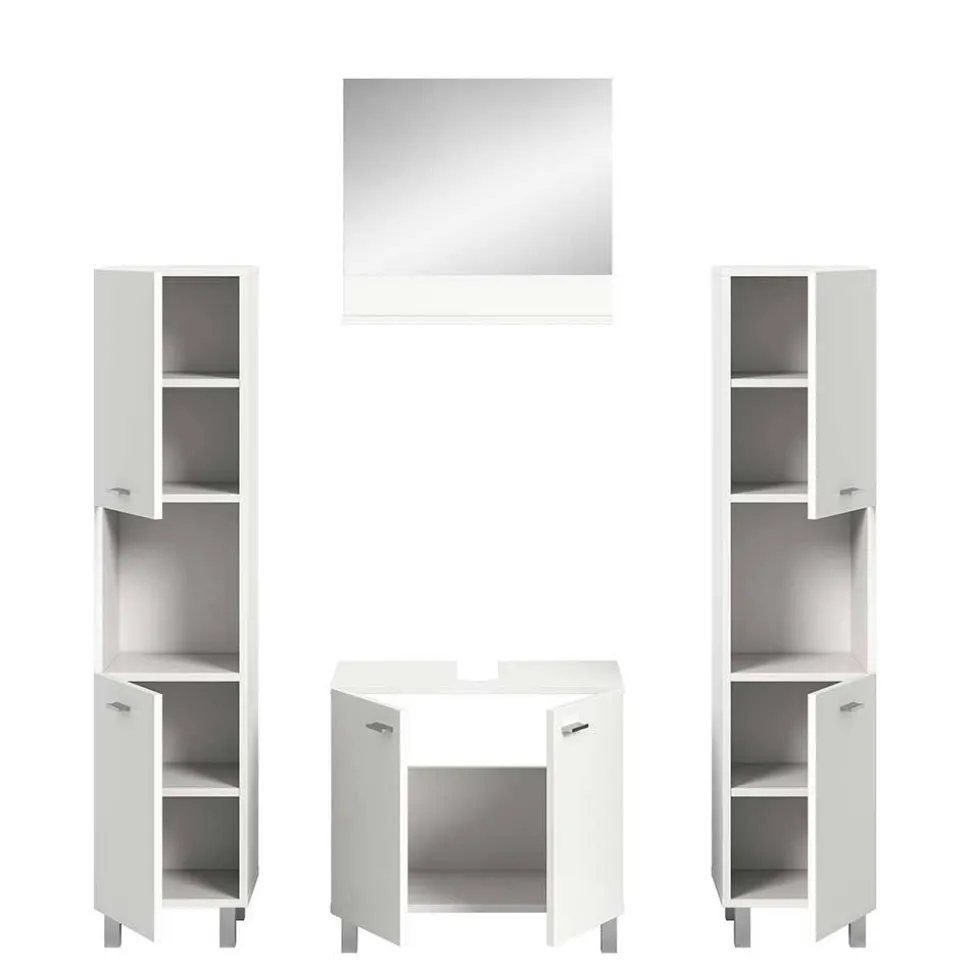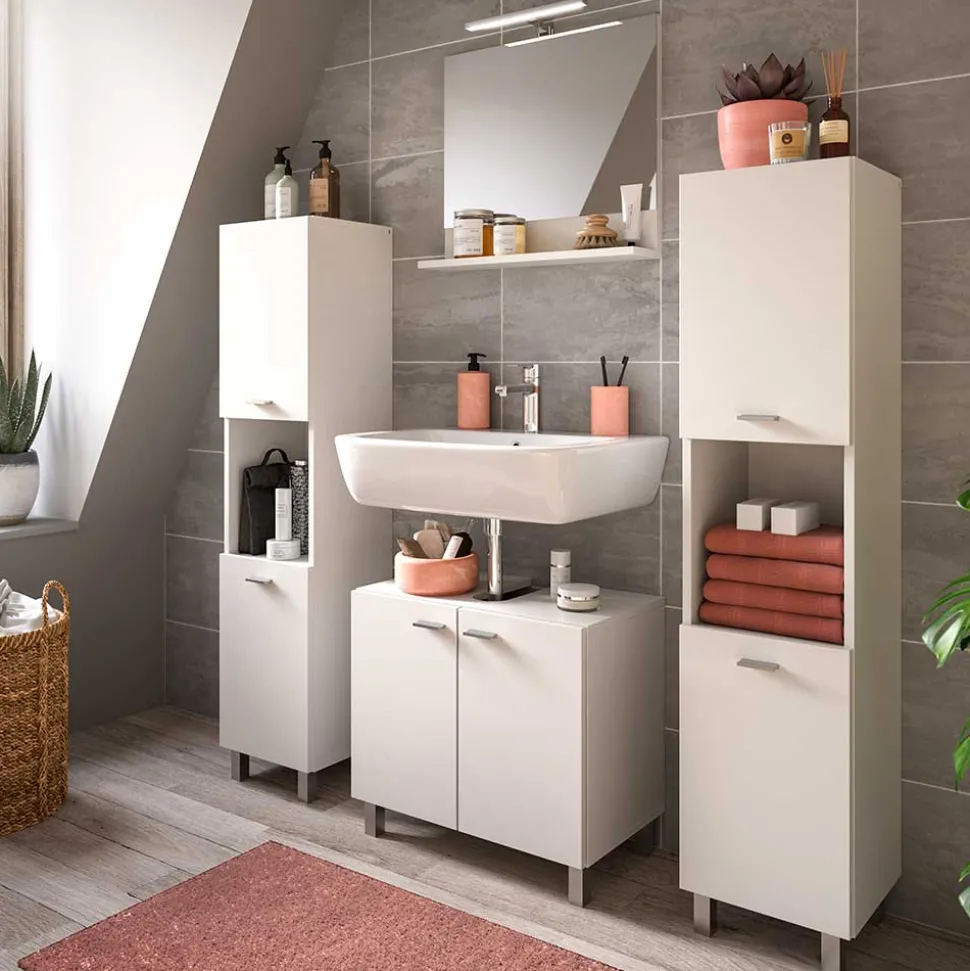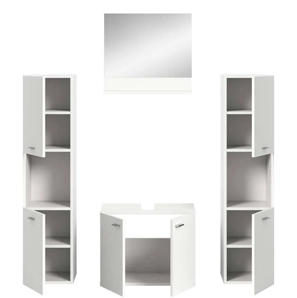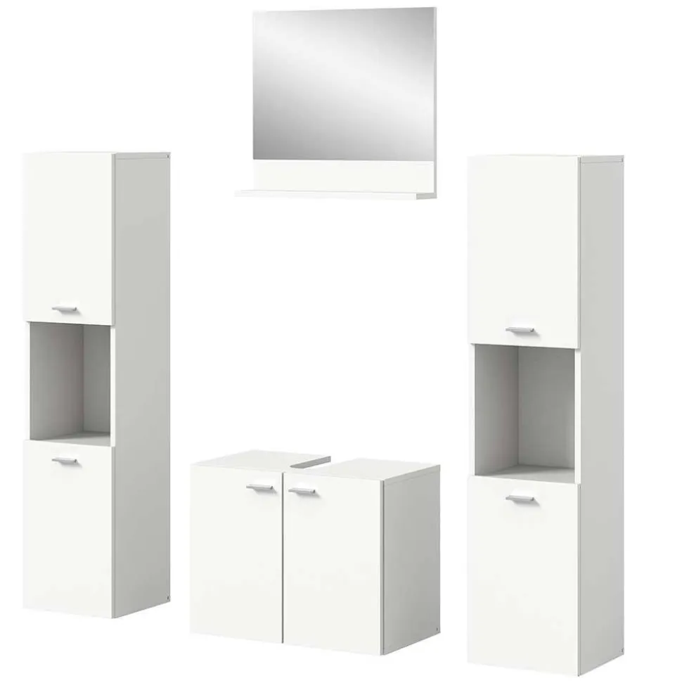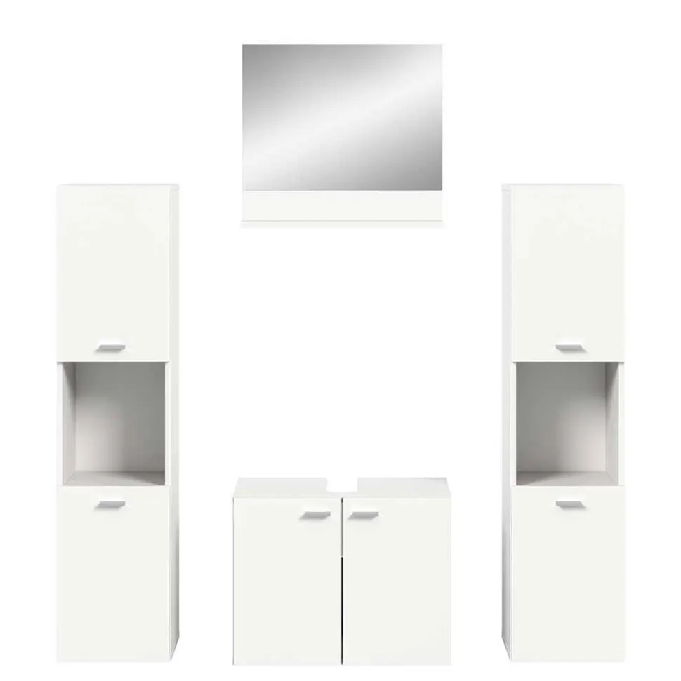 Die Badmöbel Kombination „Harmone“ vereint großzügigen Stauraum mit modernem Design in Weiß und bietet eine durchdachte Lösung für die Badezimmereinrichtung. Dieses vierteilige Set kombiniert stilvolle Optik mit funktionalen Details und sorgt für eine harmonische Atmosphäre.