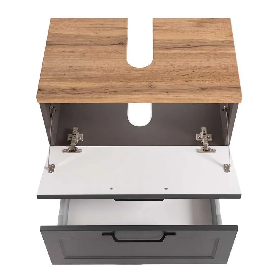 Der Waschbeckenschrank besticht mit einer 2,5 cm starken Deckplatte, die über einen präzisen Siphonausschnitt verfügt. Dieser Ausschnitt ermöglicht eine unkomplizierte Installation des Waschbeckens und des Ablaufs. Bitte beachten Sie: Ein Waschbecken ist nicht im Lieferumfang enthalten und kann separat gewählt werden, sodass Sie Ihr Bad ganz nach Ihren persönlichen Vorlieben gestalten können. Eine obere Klappe mit gedämpften Metallbeschlägen öffnet sich sanft und gibt den Blick auf ein großes Fach frei. Unterhalb befindet sich eine Schublade mit Soft-Close-Funktion und stabilem Metallauszug. Eine teilgeöffnete Rückwand sorgt dafür, dass Wasseranschlüsse problemlos zugänglich sind.