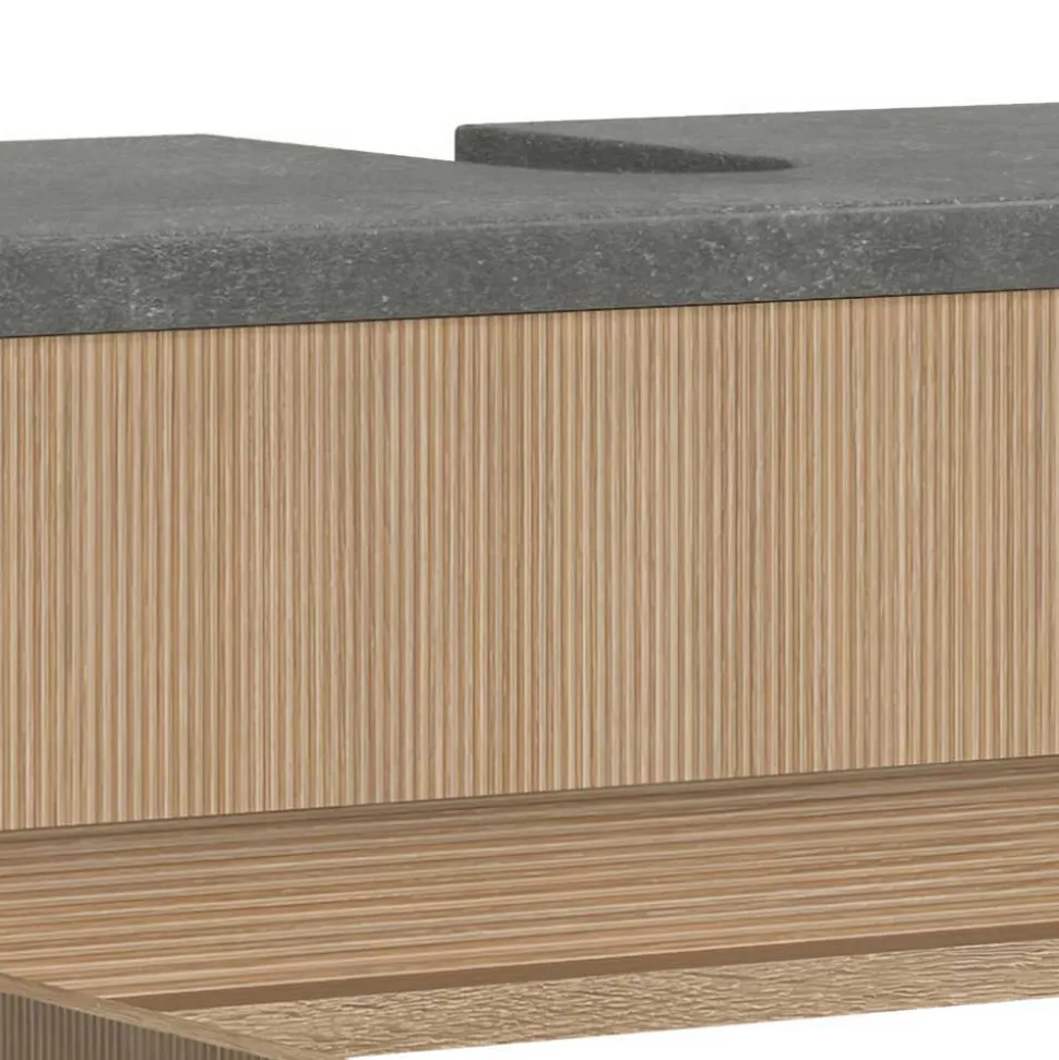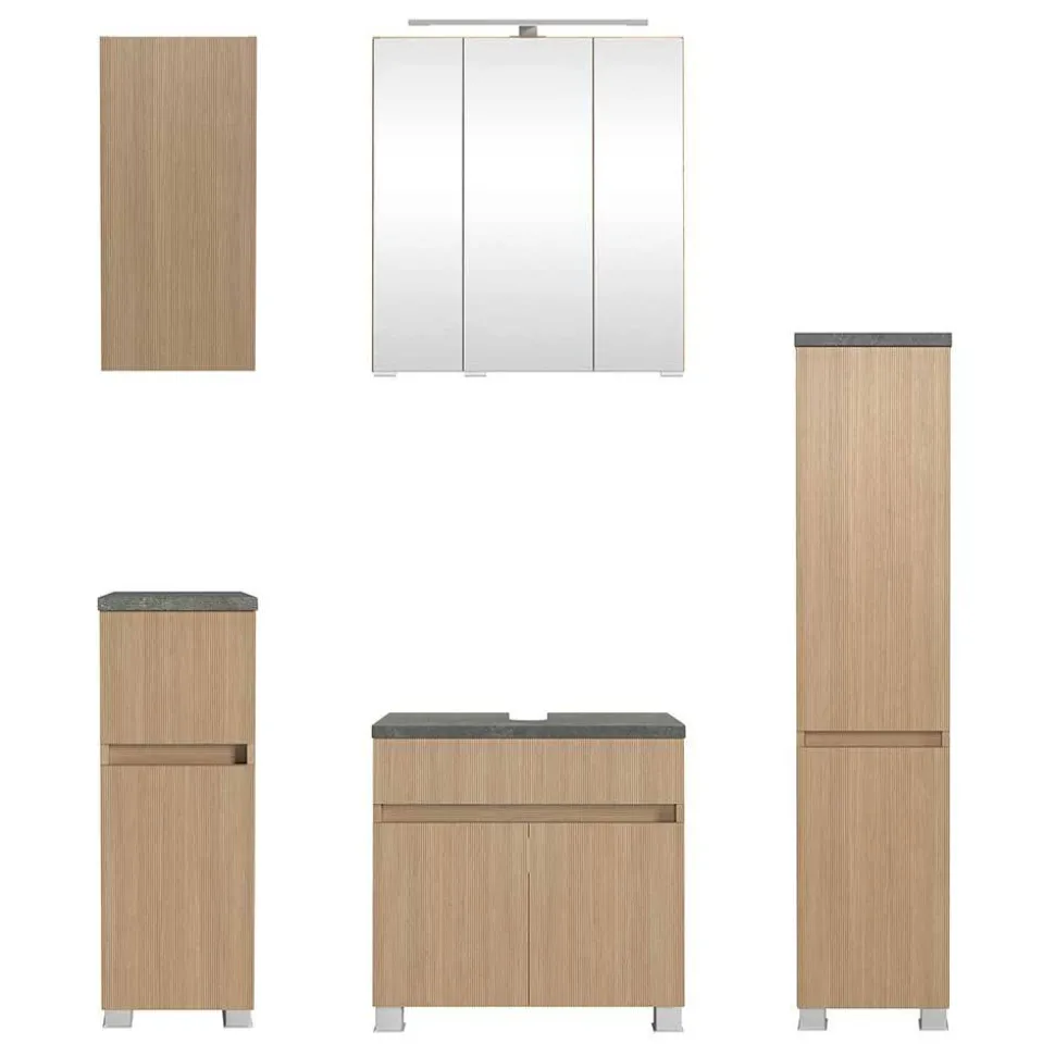 Entdecken Sie das Badmöbel Komplettset „Leitha“, das Ihre Badezimmergestaltung mit einem Hauch von natürlichem Charme und modernem Flair bereichert. Dieses fünfteilige Set umfasst alles, was Sie für eine funktionale und gleichzeitig stilvolle Badezimmereinrichtung benötigen – ideal, um Ihr Zuhause in eine Wohlfühloase zu verwandeln. Die Korpus-Oberflächen in Holzdekor Eiche Hell mit fühlbarer Struktur schaffen eine einladende Atmosphäre, während die Deckplatten in Steinoptik Dunkelgrau Ihrem Raum eine zeitgemäße und edle Optik verleihen. Jedes Möbelstück wird in Deutschland gefertigt und überzeugt durch exzellente Qualität und eine durchdachte Gestaltung.